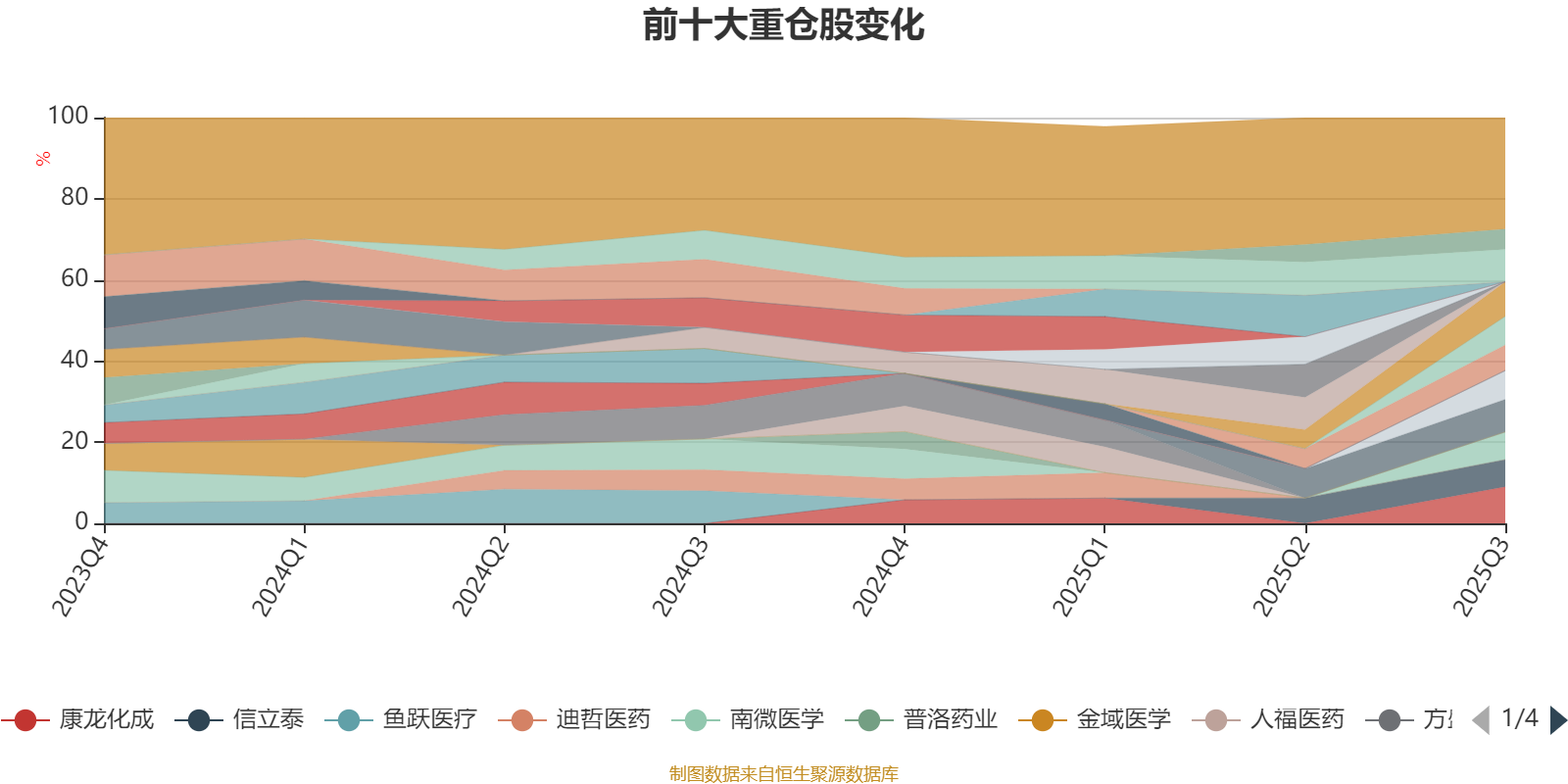 该基金持股集中度较高,近2年前十大重仓股集中度长期超过60%。截至2025年三季度末,基金十大重仓股分别是康龙化成、恒瑞医药、迈普医学、惠泰医疗、三生制药、恩华药业、南微医学、信立泰、信达生物、汇宇制药。
