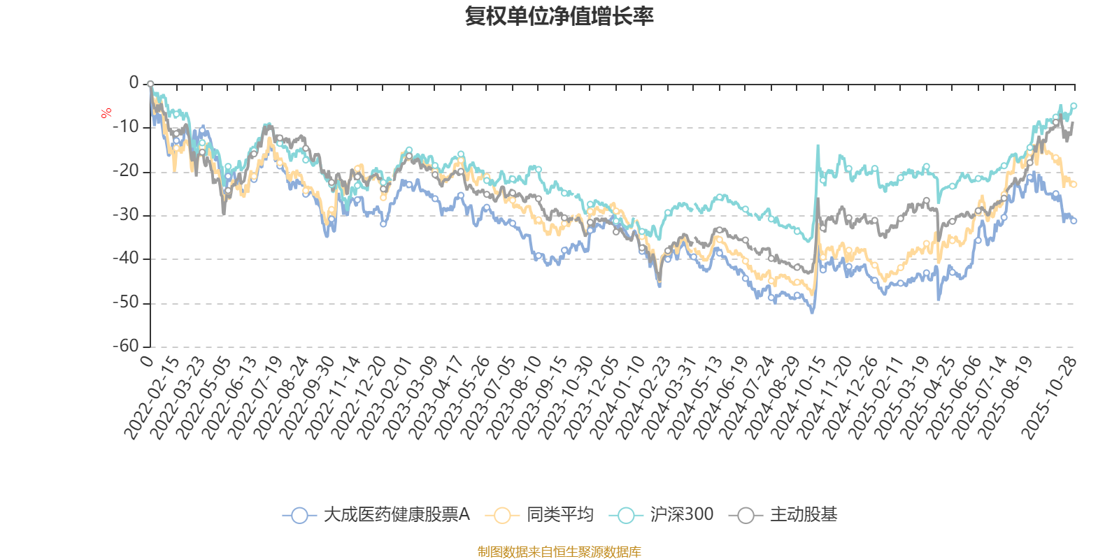 截至10月28日,大成医药健康股票A近三个月复权单位净值增长率为-8.19%,位于同类可比基金39/57;近半年复权单位净值增长率为20.42%,位于同类可比基金35/57;近一年复权单位净值增长率为13.47%,位于同类可比基金43/55;近三年复权单位净值增长率为-2.11%,位于同类可比基金29/48。