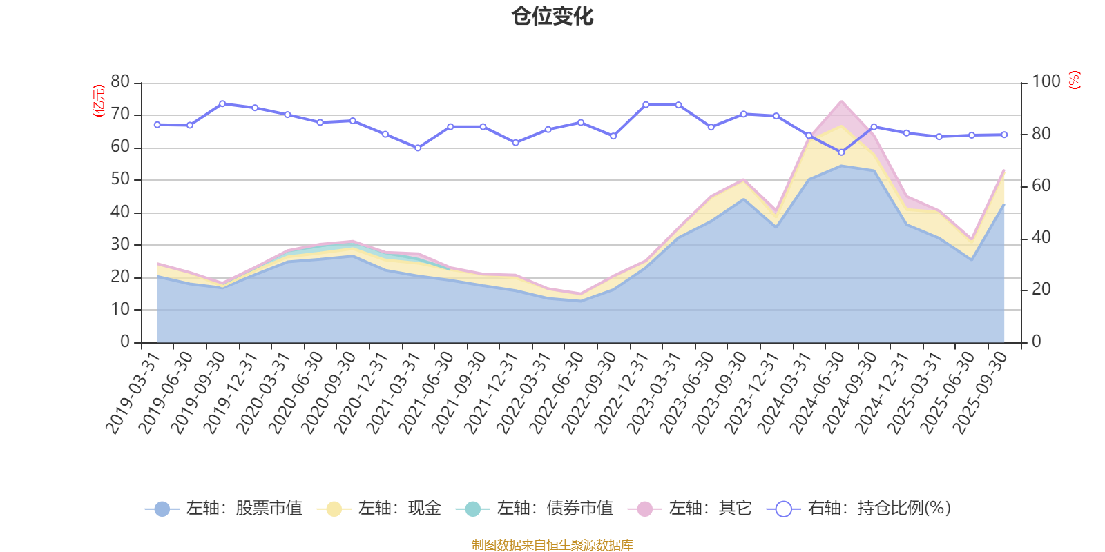 据定期报告数据统计,近三年平均股票仓位为83.08%,同类平均为88.58%。2019年三季度末基金达到91.97%的最高仓位,2024年上半年末最低,为73.23%。