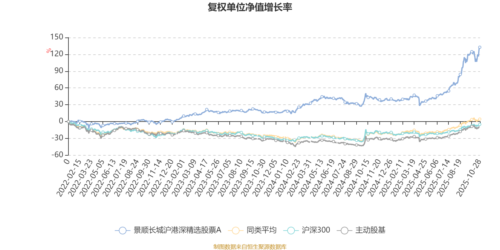 截至10月28日,景顺长城沪港深精选股票A近三个月复权单位净值增长率为39.80%,位于同类可比基金4/58;近半年复权单位净值增长率为70.36%,位于同类可比基金3/57;近一年复权单位净值增长率为63.08%,位于同类可比基金2/57;近三年复权单位净值增长率为140.27%,位于同类可比基金1/56。