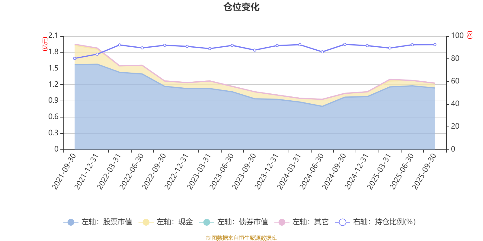 据定期报告数据统计,近三年平均股票仓位为90.73%,同类平均为88.23%。2024年三季度末基金达到92.76%的最高仓位,2021年三季度末最低,为80.37%。