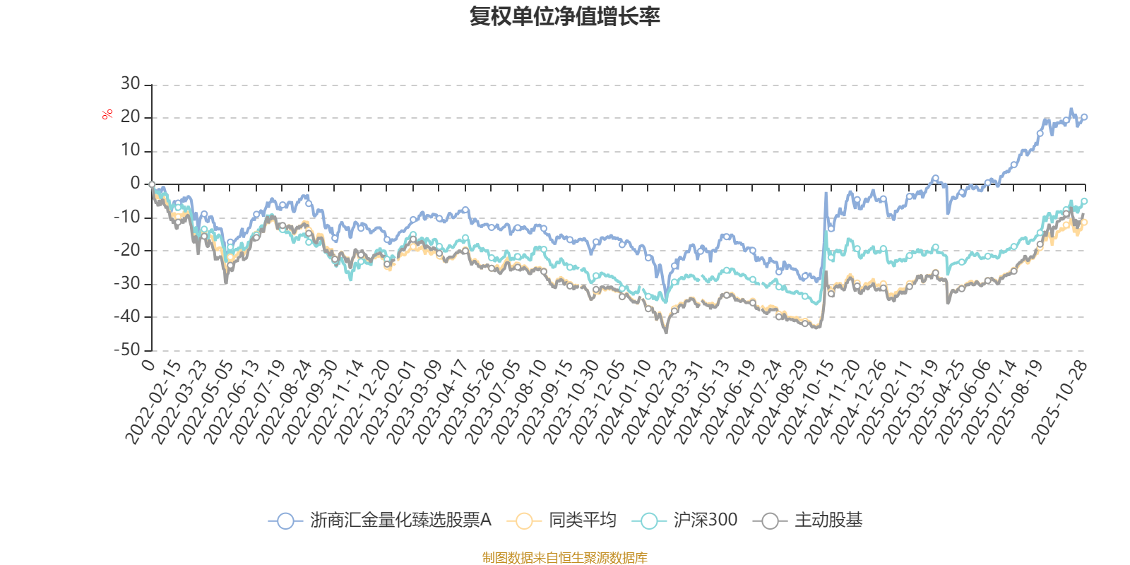 截至10月28日,浙商汇金量化臻选股票A近三个月复权单位净值增长率为9.23%,位于同类可比基金77/121;近半年复权单位净值增长率为24.76%,位于同类可比基金73/121;近一年复权单位净值增长率为29.36%,位于同类可比基金48/115;近三年复权单位净值增长率为43.02%,位于同类可比基金20/87。