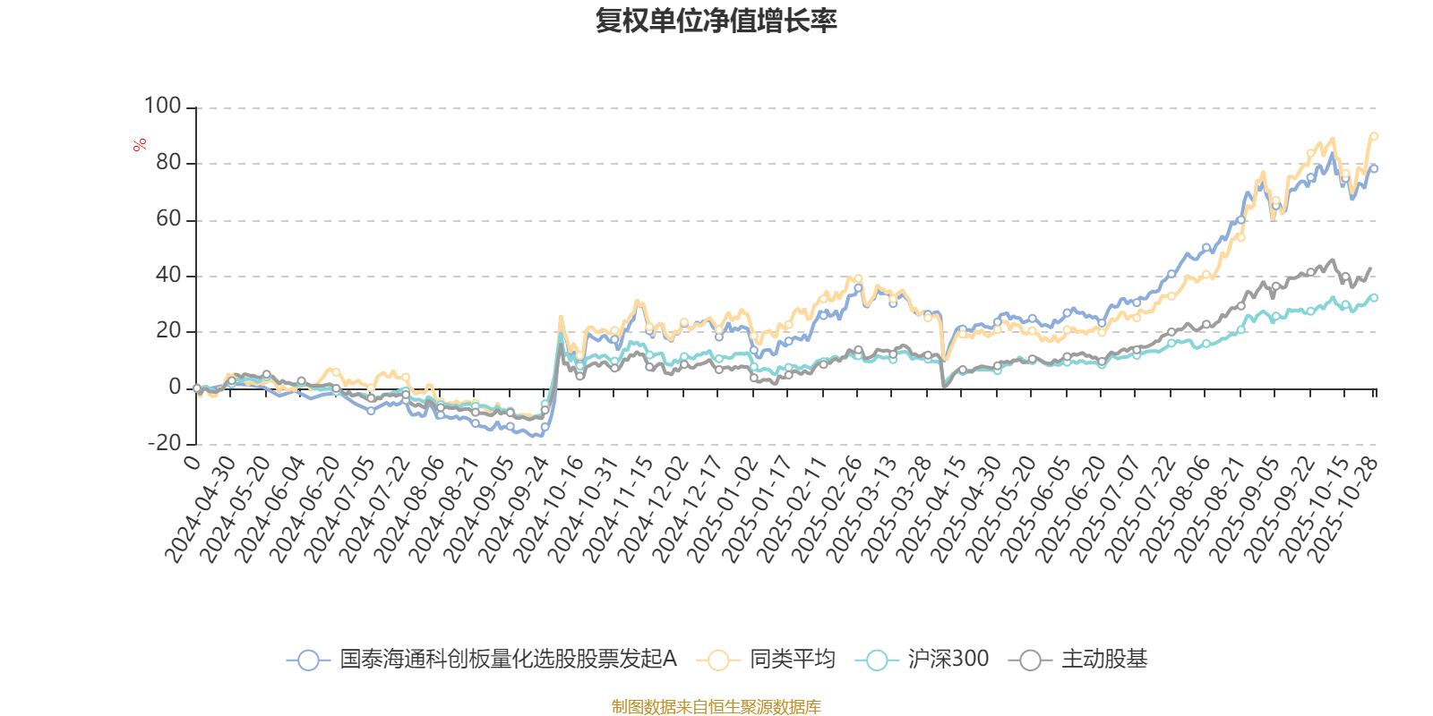 截至10月28日,国泰海通科创板量化选股股票发起A近三个月复权单位净值增长率为21.93%,位于同类可比基金50/63;近半年复权单位净值增长率为46.79%,位于同类可比基金38/63;近一年复权单位净值增长率为50.00%,位于同类可比基金36/61。