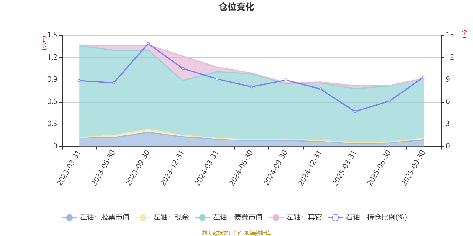据定期报告数据统计,成立以来平均股票仓位为8.74%,同类平均为19.14%。2023年三季度末基金达到13.9%的最高仓位,2025年一季度末最低,为4.71%。
