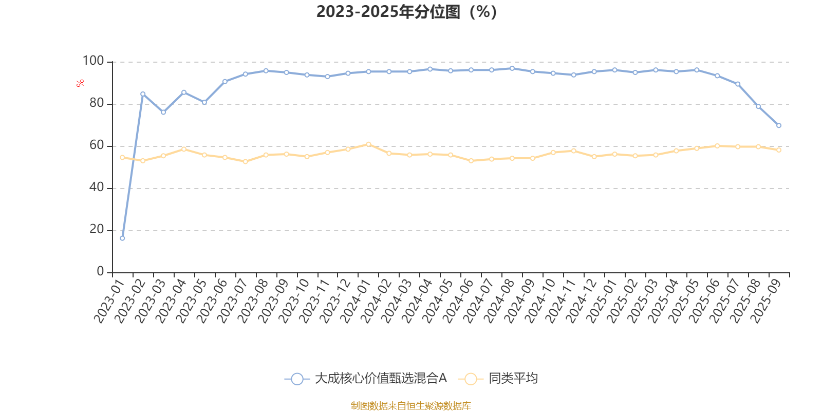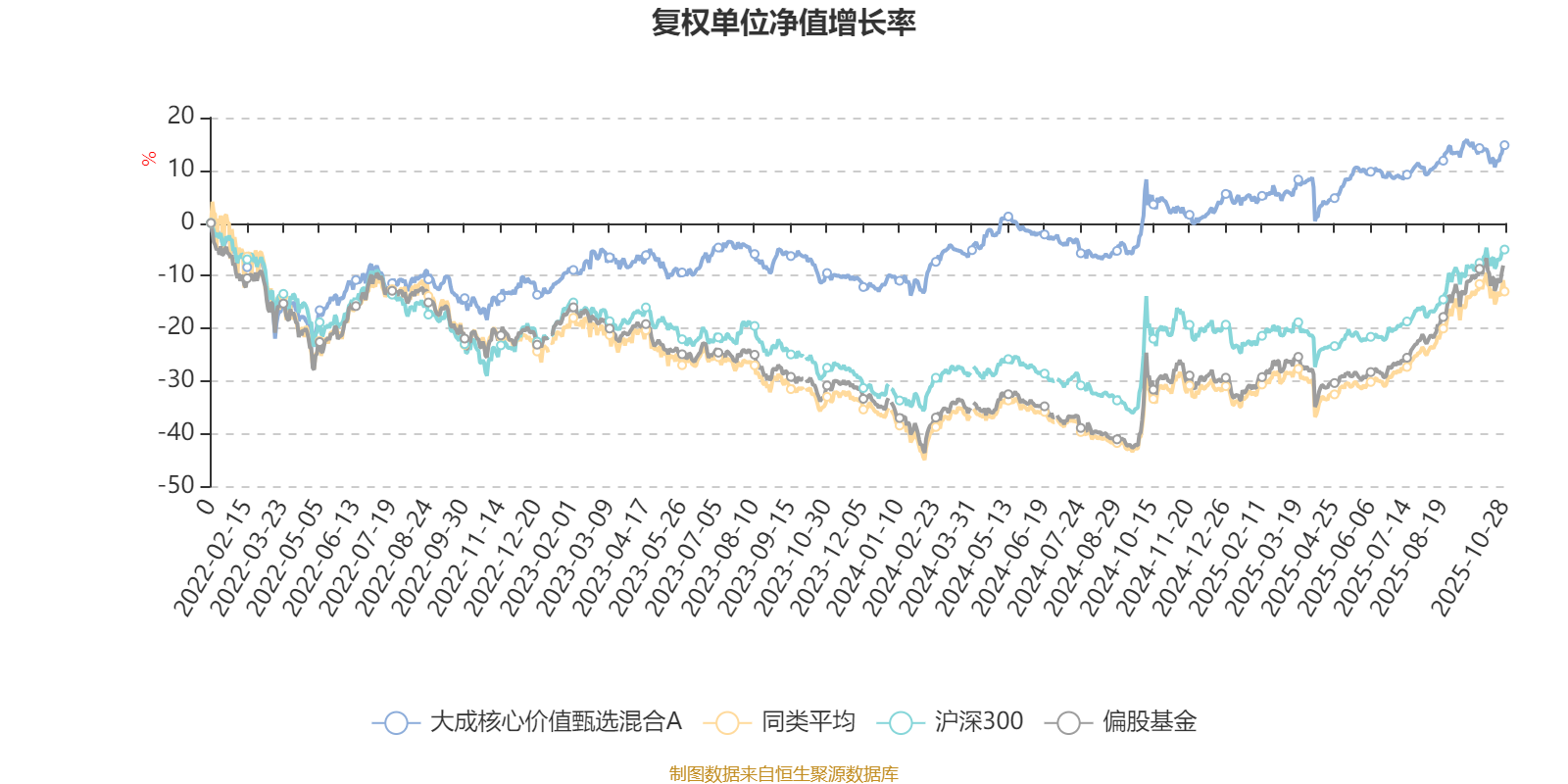 截至10月28日,大成核心价值甄选混合A近三个月复权单位净值增长率为3.75%,位于同类可比基金240/265;近半年复权单位净值增长率为9.29%,位于同类可比基金252/265;近一年复权单位净值增长率为10.33%,位于同类可比基金238/265;近三年复权单位净值增长率为39.04%,位于同类可比基金55/253。