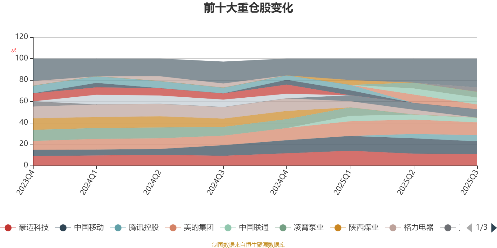 该基金持股集中度较高,近2年前十大重仓股集中度长期超过60%。截至2025年三季度末,基金十大重仓股分别是美的集团、中国移动、豪迈科技、福耀玻璃、华域汽车、腾讯控股、海尔智家、中国海洋石油、中国联通、美团-W。
