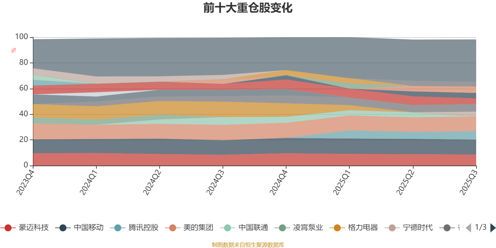 该基金持股集中度较高,近2年前十大重仓股集中度长期超过60%。截至2025年三季度末,基金十大重仓股分别是中国移动、美的集团、豪迈科技、腾讯控股、福耀玻璃、海尔智家、中国海洋石油、华域汽车、宁德时代、长和。