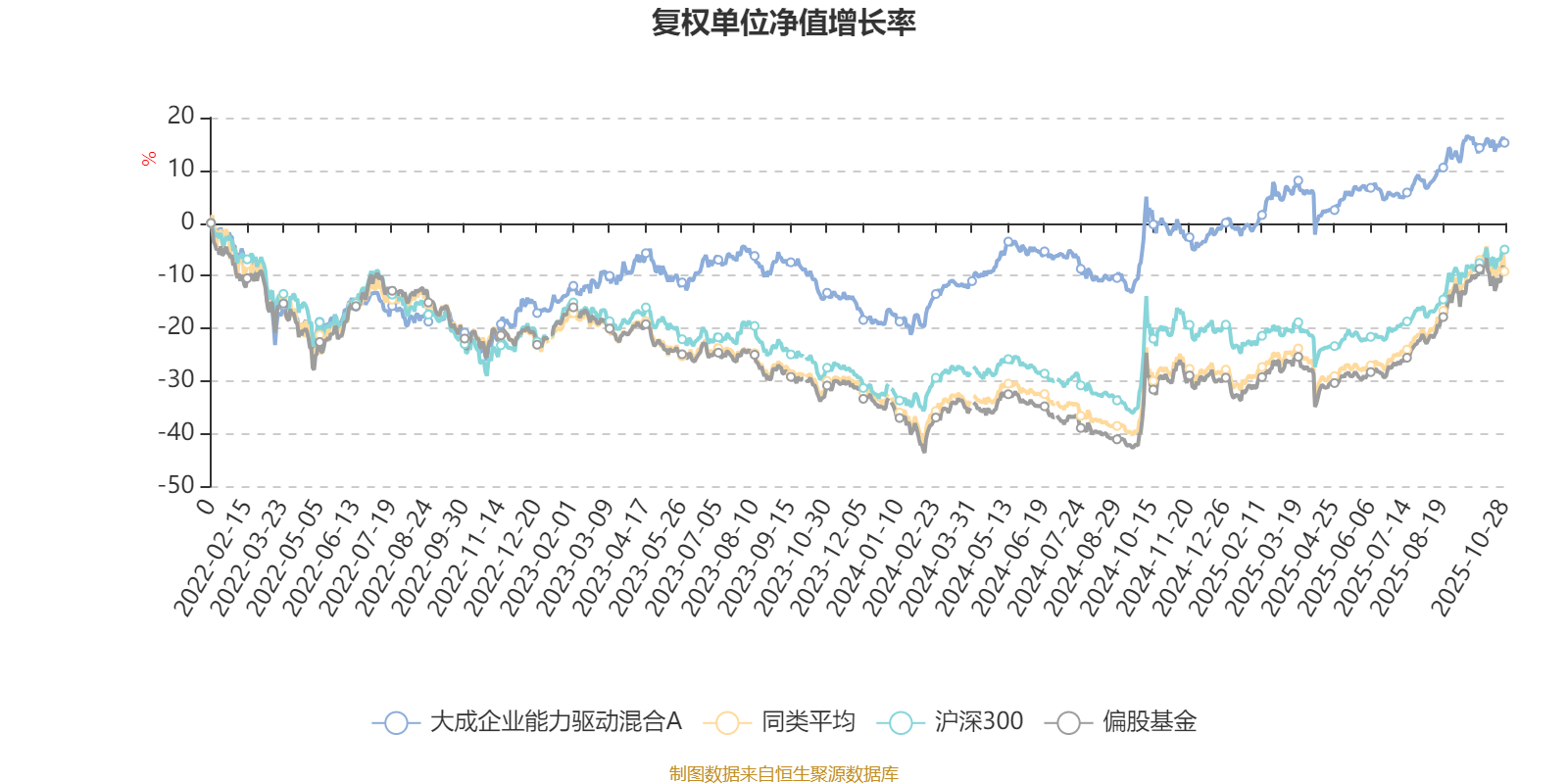 截至10月28日,大成企业能力驱动混合A近三个月复权单位净值增长率为6.50%,位于同类可比基金104/130;近半年复权单位净值增长率为11.66%,位于同类可比基金113/130;近一年复权单位净值增长率为15.40%,位于同类可比基金100/130;近三年复权单位净值增长率为54.53%,位于同类可比基金20/124。