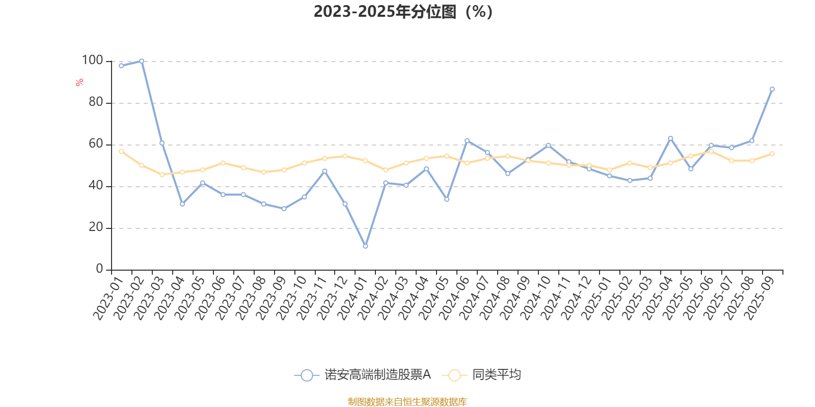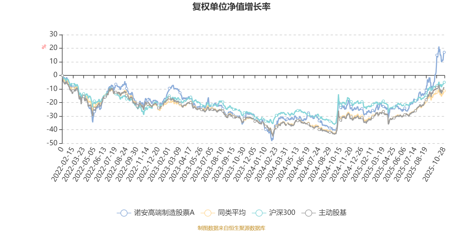 截至10月28日,诺安高端制造股票A近三个月复权单位净值增长率为34.62%,位于同类可比基金4/121;近半年复权单位净值增长率为54.45%,位于同类可比基金10/121;近一年复权单位净值增长率为50.90%,位于同类可比基金11/115;近三年复权单位净值增长率为52.82%,位于同类可比基金13/87。