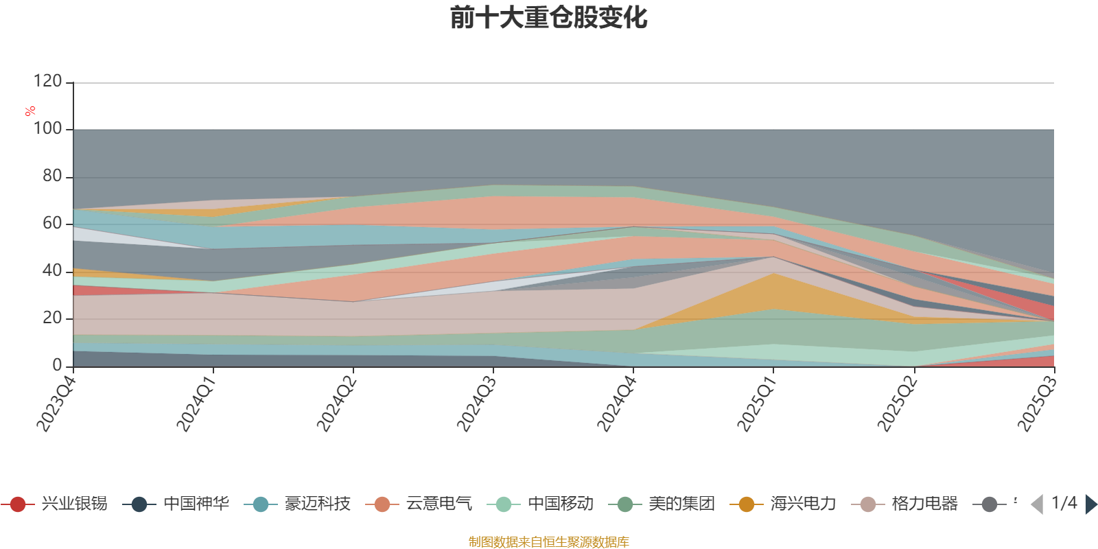 截至2025年三季度末,基金十大重仓股分别是锡业股份、美的集团、齐鲁银行、兴业银锡、恩华药业、中国移动、豪迈科技、振华风光、云意电气、时代电气。