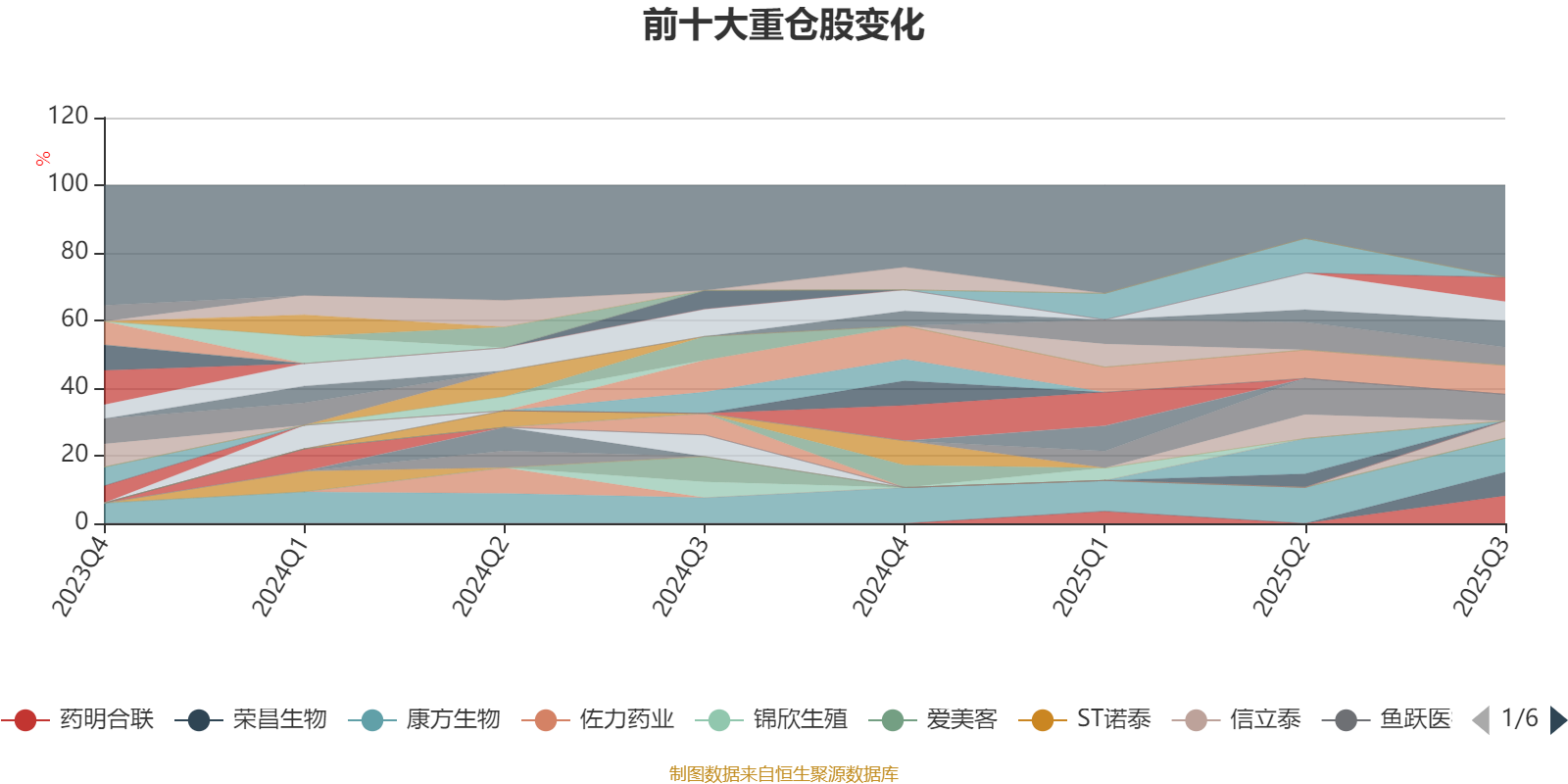 该基金持股集中度较高,近2年前十大重仓股集中度长期超过60%。截至2025年三季度末,基金十大重仓股分别是康方生物、科伦博泰生物-B、药明合联、三生制药、百利天恒、恒瑞医药、荣昌生物、信达生物、迈威生物、信立泰。