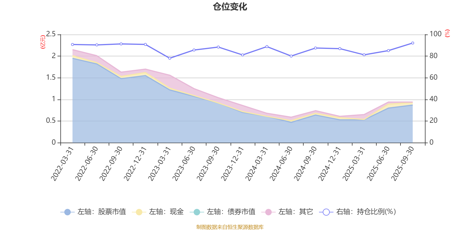 据定期报告数据统计,近三年平均股票仓位为85.5%,同类平均为88.38%。2025年三季度末基金达到92.12%的最高仓位,2023年一季度末最低,为78.09%。