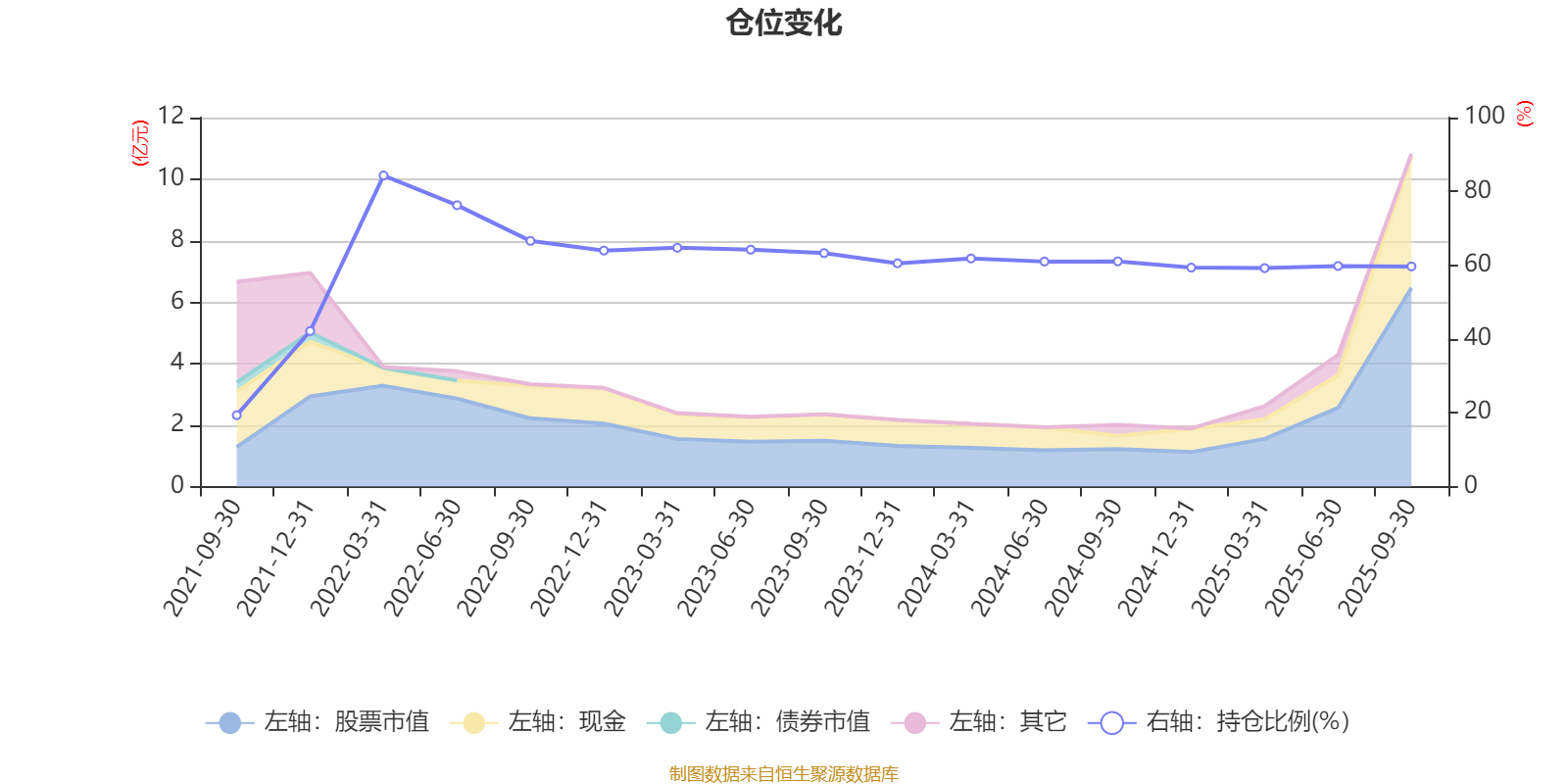 据定期报告数据统计,近三年平均股票仓位为61.55%,同类平均为85.66%。2022年一季度末基金达到84.32%的最高仓位,2021年三季度末最低,为19.35%。