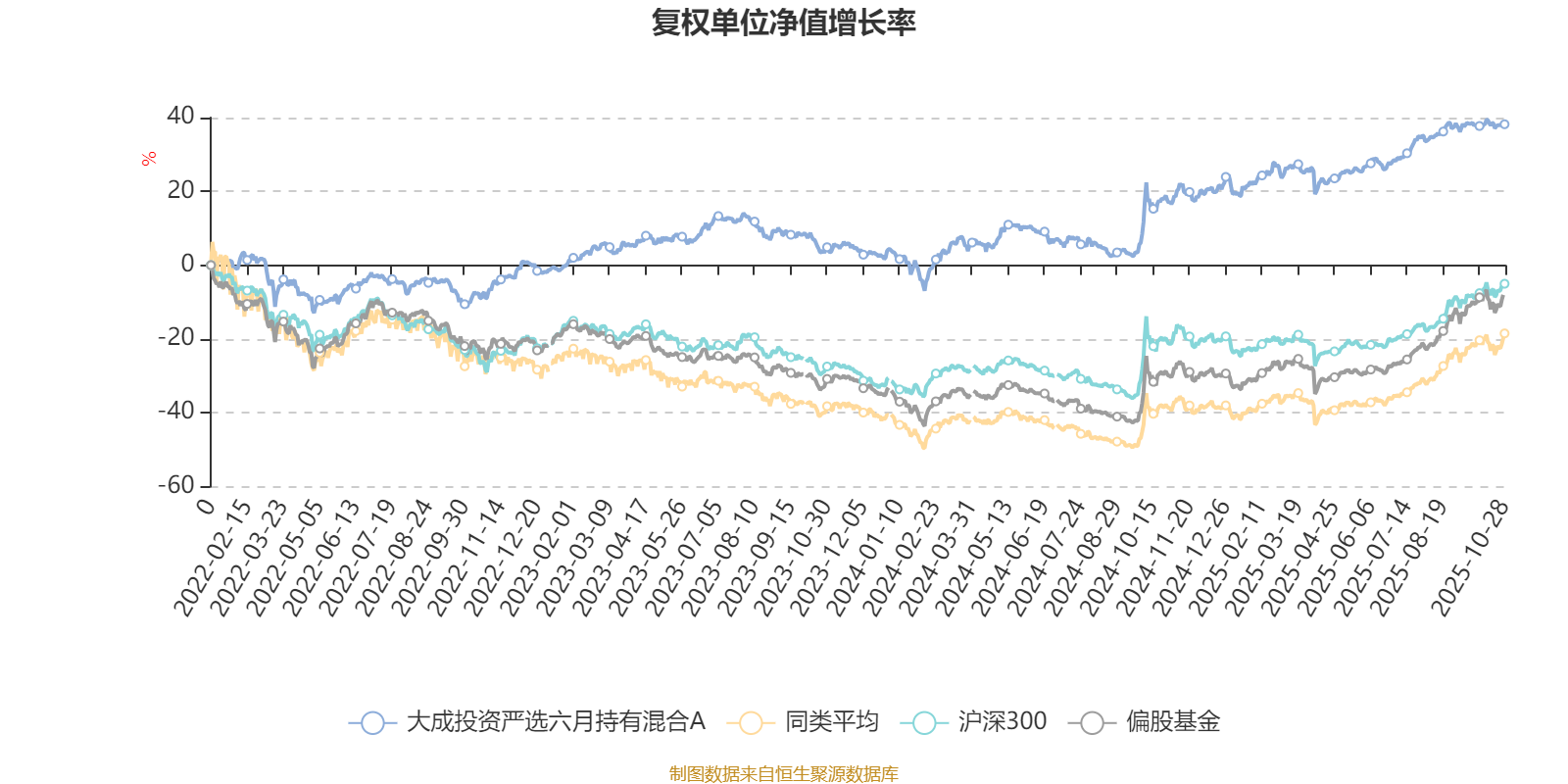 截至10月28日,大成投资严选六月持有混合A近三个月复权单位净值增长率为2.75%,位于同类可比基金560/621;近半年复权单位净值增长率为12.43%,位于同类可比基金548/619;近一年复权单位净值增长率为16.28%,位于同类可比基金465/611;近三年复权单位净值增长率为51.88%,位于同类可比基金67/518。