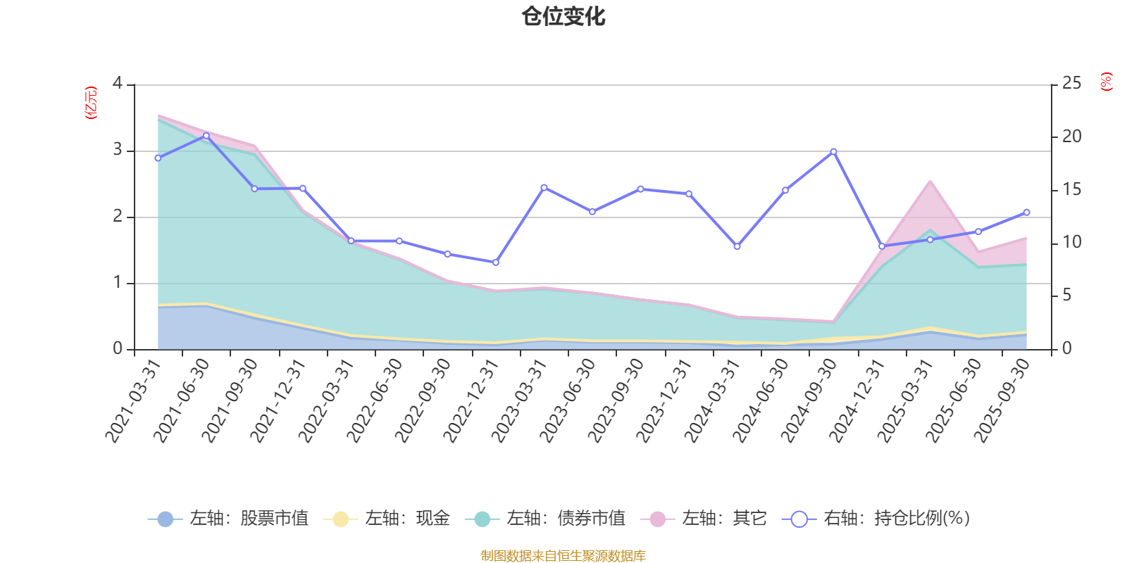 据定期报告数据统计,近三年平均股票仓位为12.82%,同类平均为19.14%。2021年上半年末基金达到20.17%的最高仓位,2022年末最低,为8.21%。