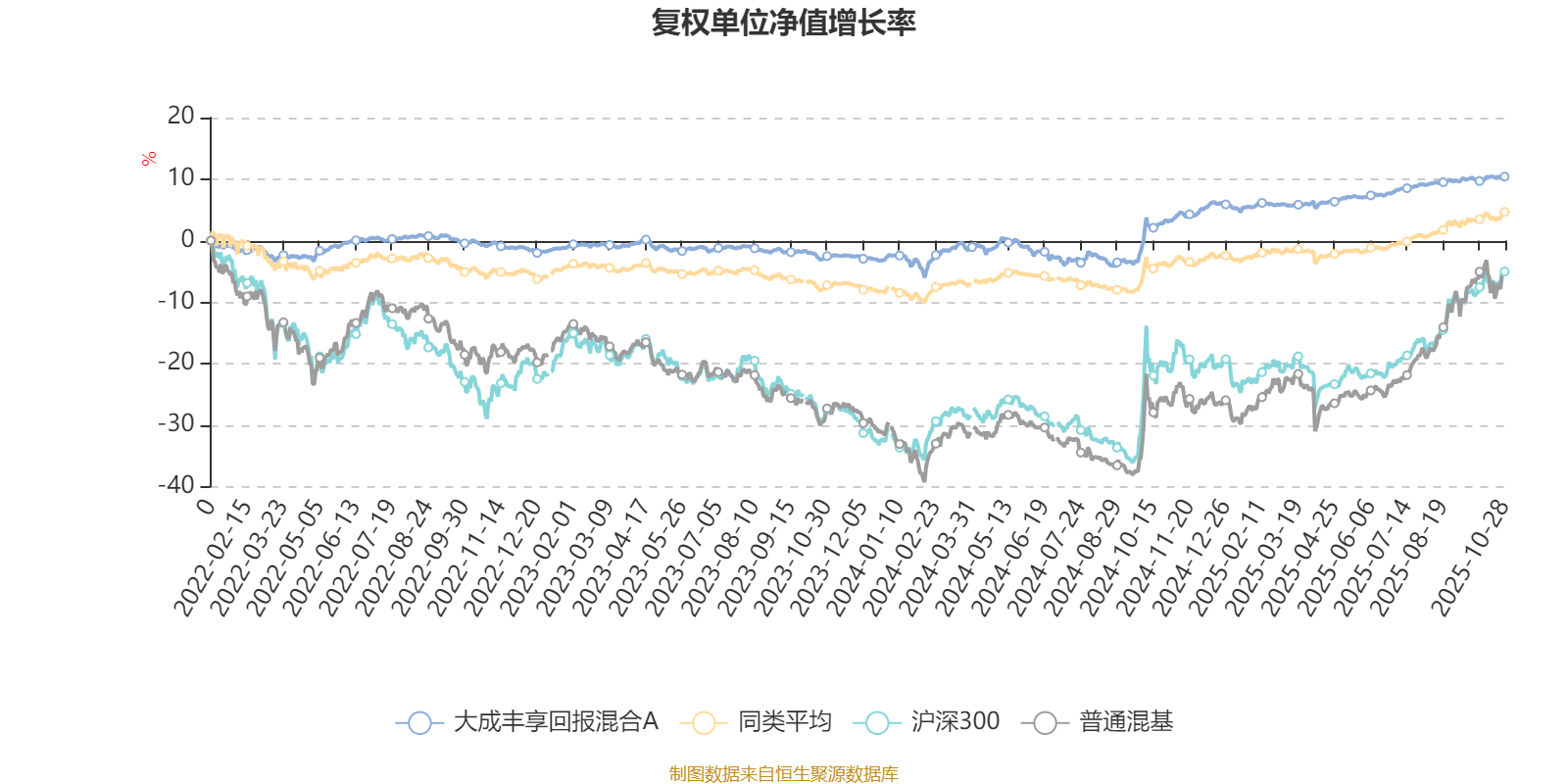 截至10月28日,大成丰享回报混合A近三个月复权单位净值增长率为1.14%,位于同类可比基金471/629;近半年复权单位净值增长率为3.83%,位于同类可比基金436/629;近一年复权单位净值增长率为6.78%,位于同类可比基金314/623;近三年复权单位净值增长率为11.35%,位于同类可比基金293/557。