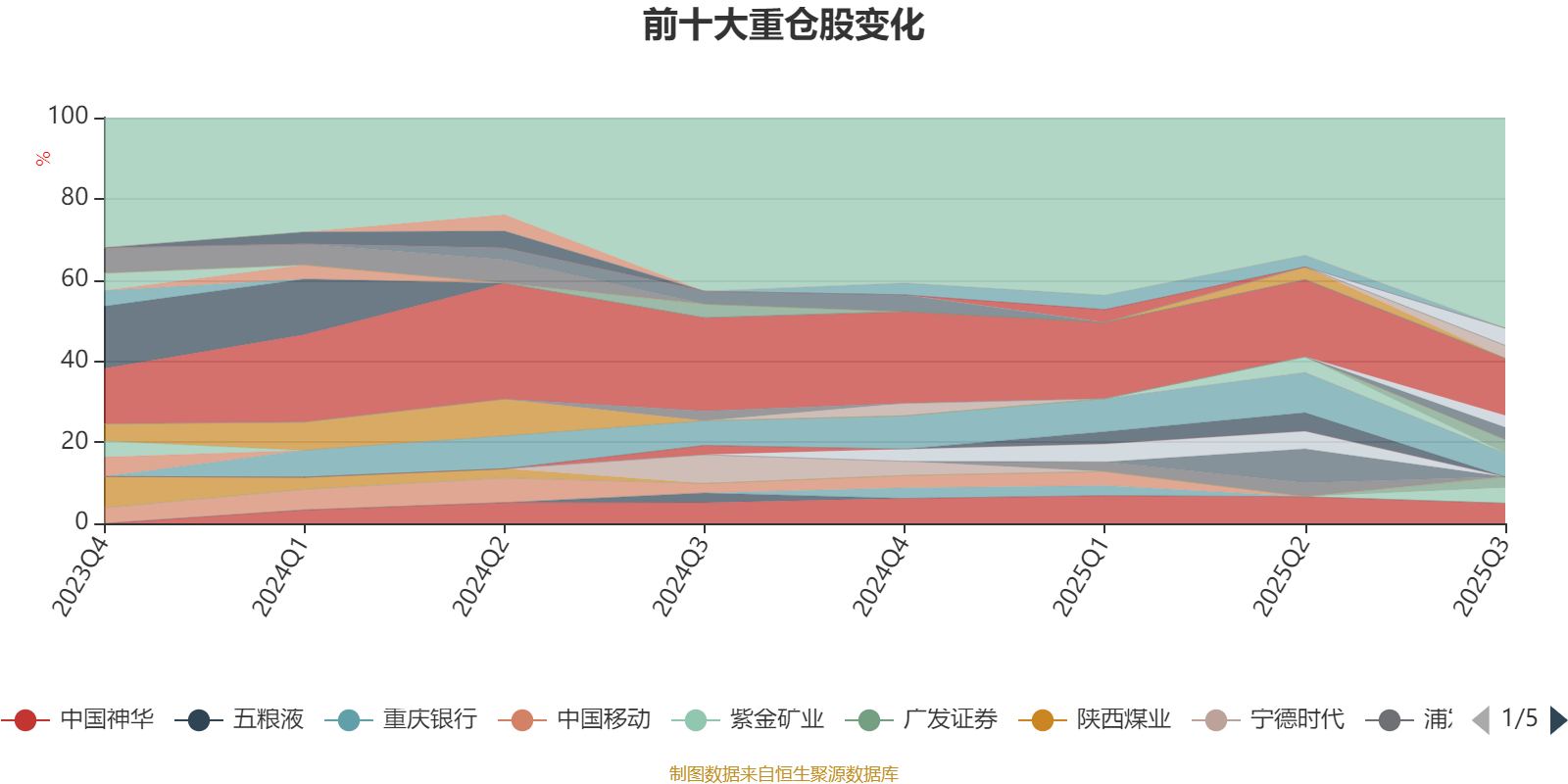 截至2025年三季度末,基金十大重仓股分别是长江电力、农业银行、中国神华、工业富联、紫金矿业、东吴证券、拓普集团、恒瑞医药、中芯国际、广发证券。