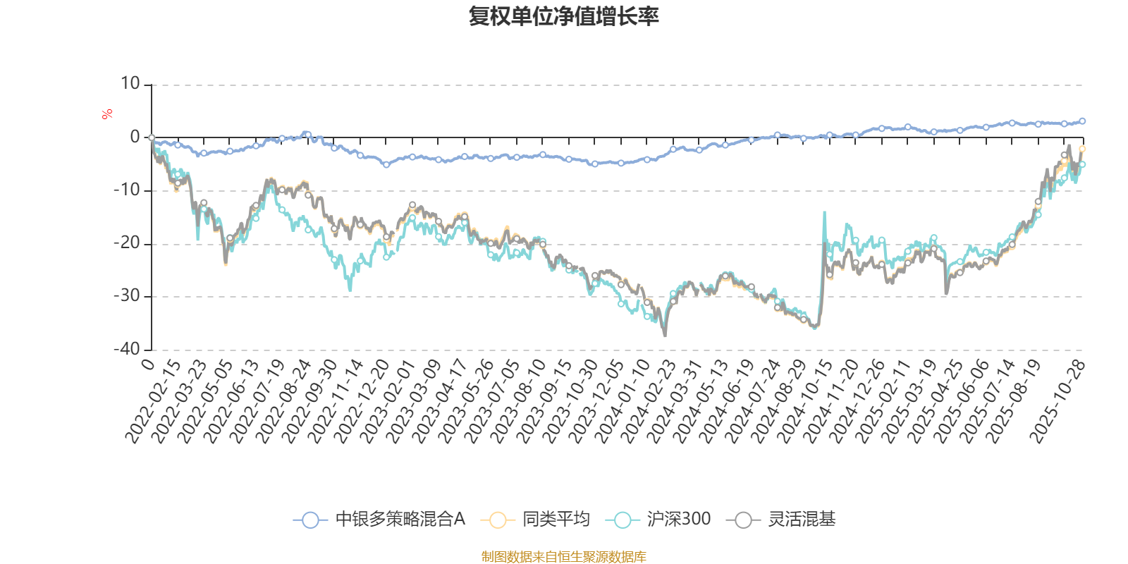 截至10月28日,中银多策略混合A近三个月复权单位净值增长率为0.64%,位于同类可比基金1181/1287;近半年复权单位净值增长率为1.65%,位于同类可比基金1255/1287;近一年复权单位净值增长率为2.90%,位于同类可比基金1200/1287;近三年复权单位净值增长率为6.05%,位于同类可比基金893/1286。