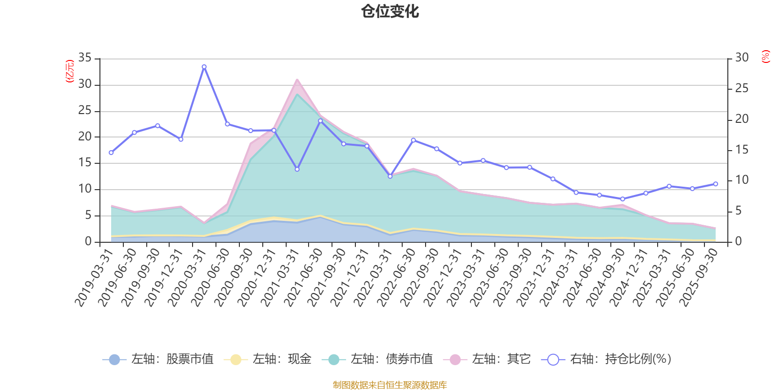 据定期报告数据统计,近三年平均股票仓位为9.93%,同类平均为72.35%。2020年一季度末基金达到28.65%的最高仓位,2024年三季度末最低,为7.04%。