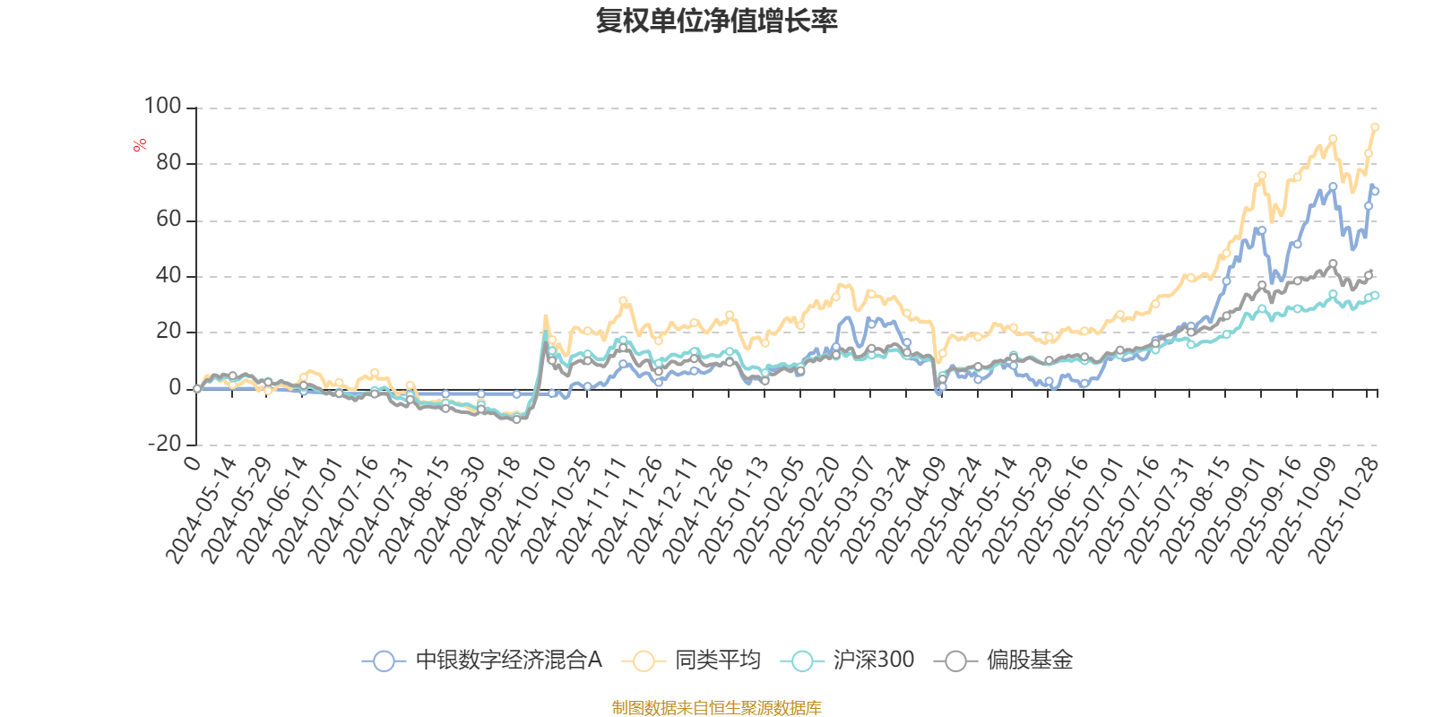 截至10月28日,中银数字经济混合A近三个月复权单位净值增长率为39.77%,位于同类可比基金101/229;近半年复权单位净值增长率为63.97%,位于同类可比基金85/229;近一年复权单位净值增长率为69.10%,位于同类可比基金62/213。