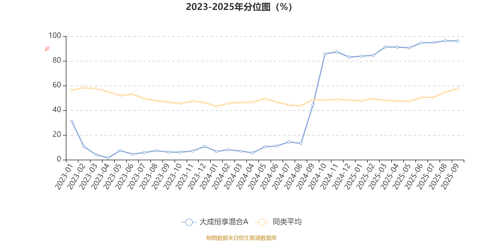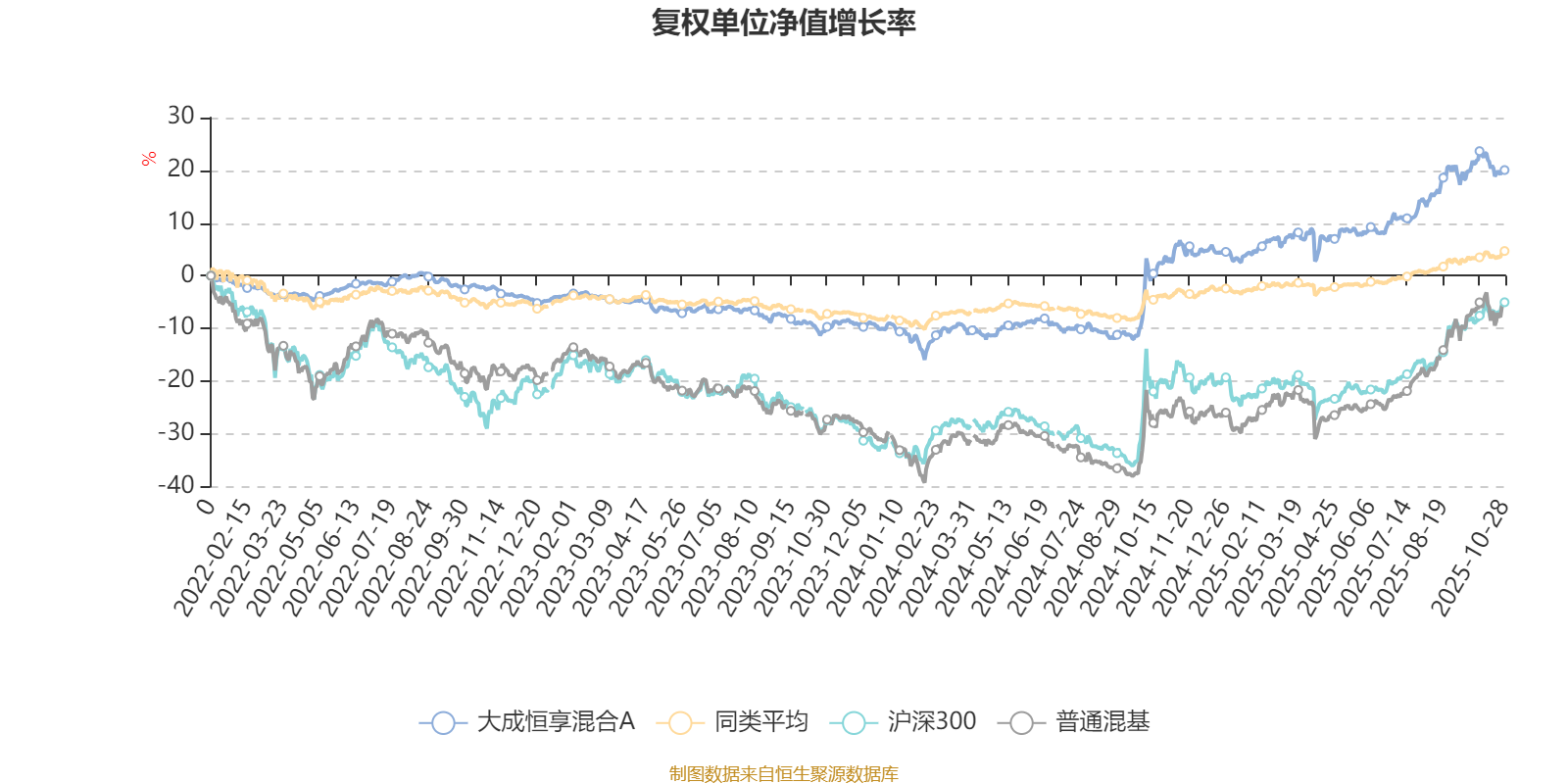 截至10月28日,大成恒享混合A近三个月复权单位净值增长率为5.23%,位于同类可比基金91/629;近半年复权单位净值增长率为12.39%,位于同类可比基金58/629;近一年复权单位净值增长率为15.71%,位于同类可比基金42/623;近三年复权单位净值增长率为23.27%,位于同类可比基金50/557。