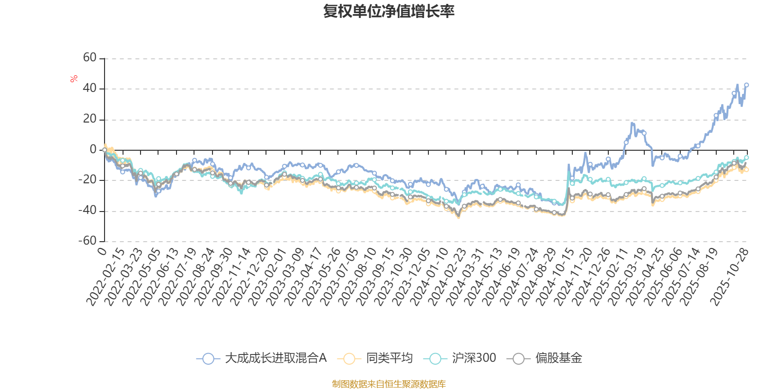 截至10月28日,大成成长进取混合A近三个月复权单位净值增长率为31.54%,位于同类可比基金32/265;近半年复权单位净值增长率为49.93%,位于同类可比基金37/265;近一年复权单位净值增长率为63.23%,位于同类可比基金13/265;近三年复权单位净值增长率为64.01%,位于同类可比基金12/253。