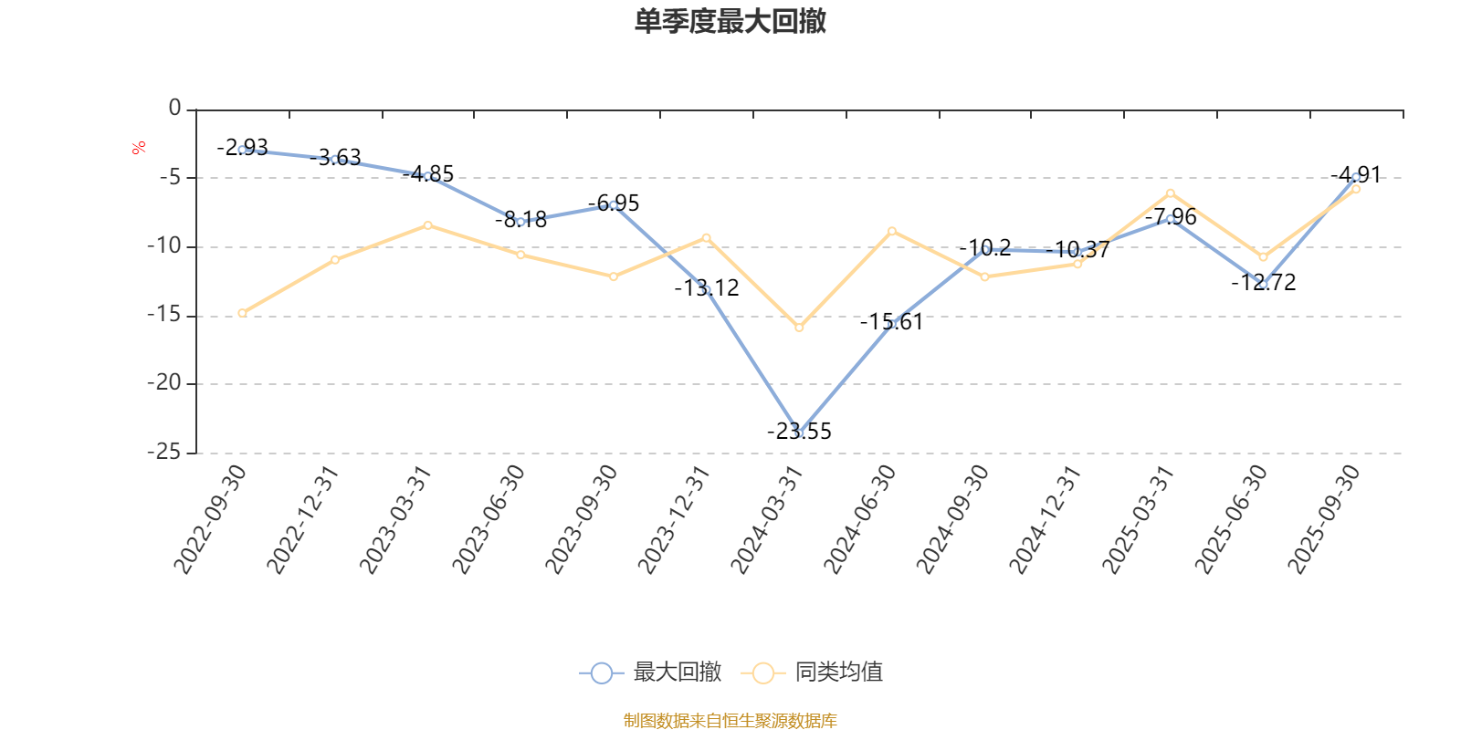 截至10月27日,基金近三年最大回撤为39.85%,同类可比基金排名211/363。单季度最大回撤出现在2024年一季度,为23.55%。