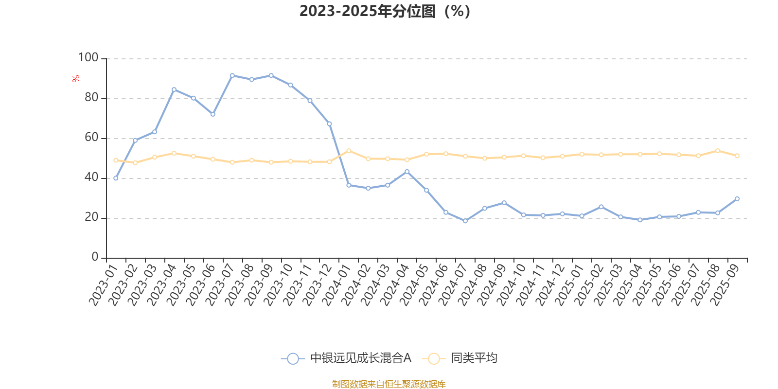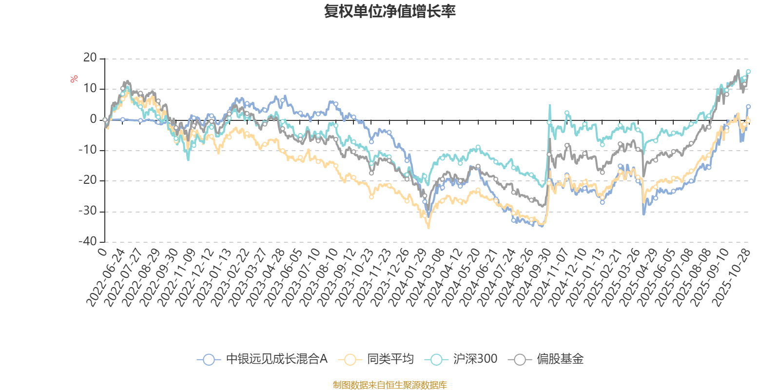 截至10月28日,中银远见成长混合A近三个月复权单位净值增长率为22.79%,位于同类可比基金148/689;近半年复权单位净值增长率为41.13%,位于同类可比基金147/688;近一年复权单位净值增长率为32.37%,位于同类可比基金230/653;近三年复权单位净值增长率为6.62%,位于同类可比基金225/364。