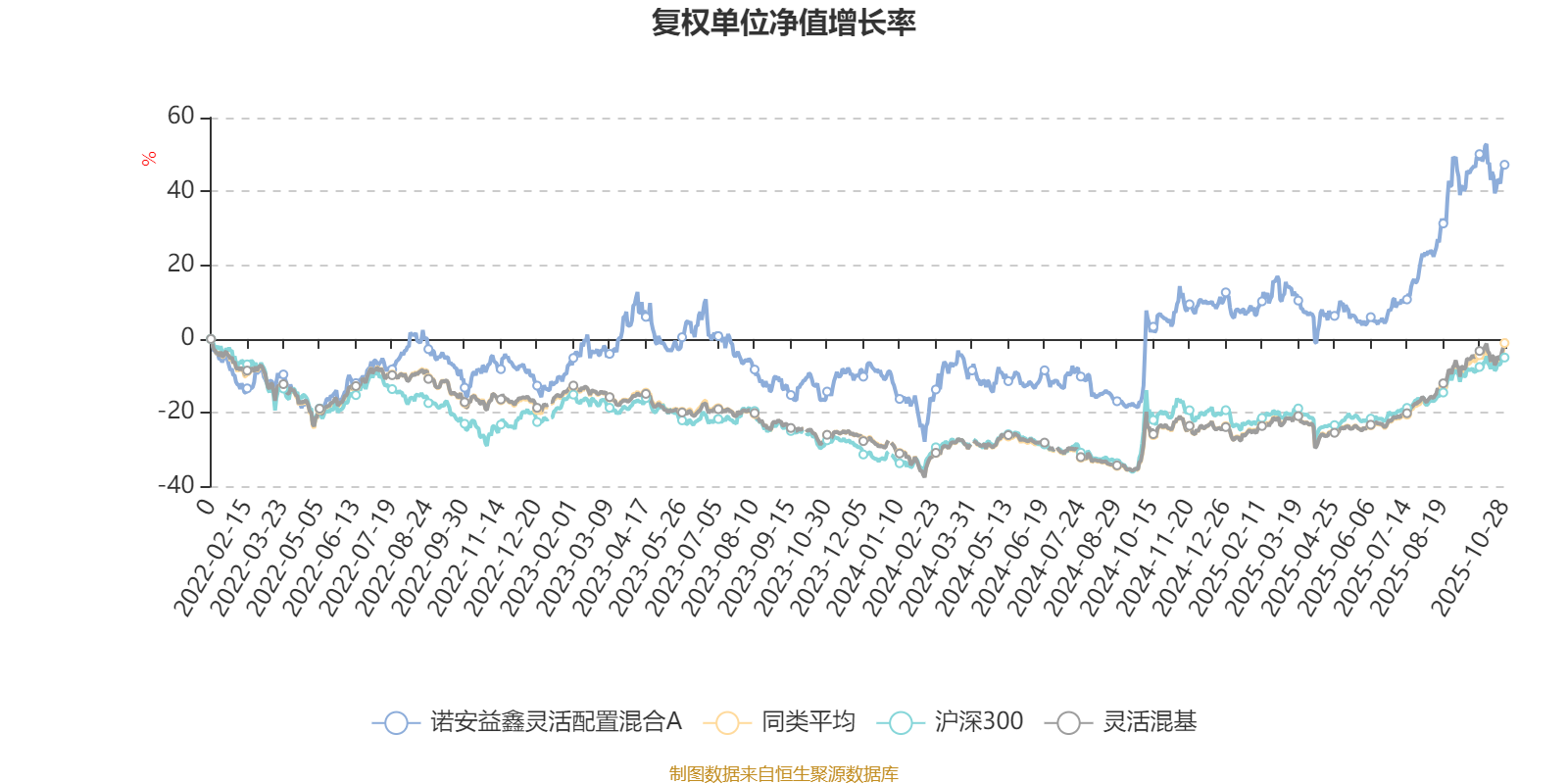 截至10月28日,诺安益鑫灵活配置混合A近三个月复权单位净值增长率为21.31%,位于同类可比基金347/1287;近半年复权单位净值增长率为38.73%,位于同类可比基金299/1287;近一年复权单位净值增长率为39.53%,位于同类可比基金259/1287;近三年复权单位净值增长率为61.77%,位于同类可比基金97/1286。