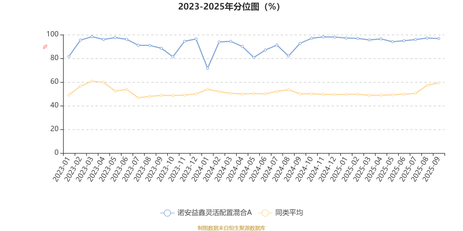 通过所选区间该基金净值增长率分位图,可以观察该基金与同类基金业绩比较情况。图为坐标原点到区间内某时点的净值增长率在同类基金中的分位数。