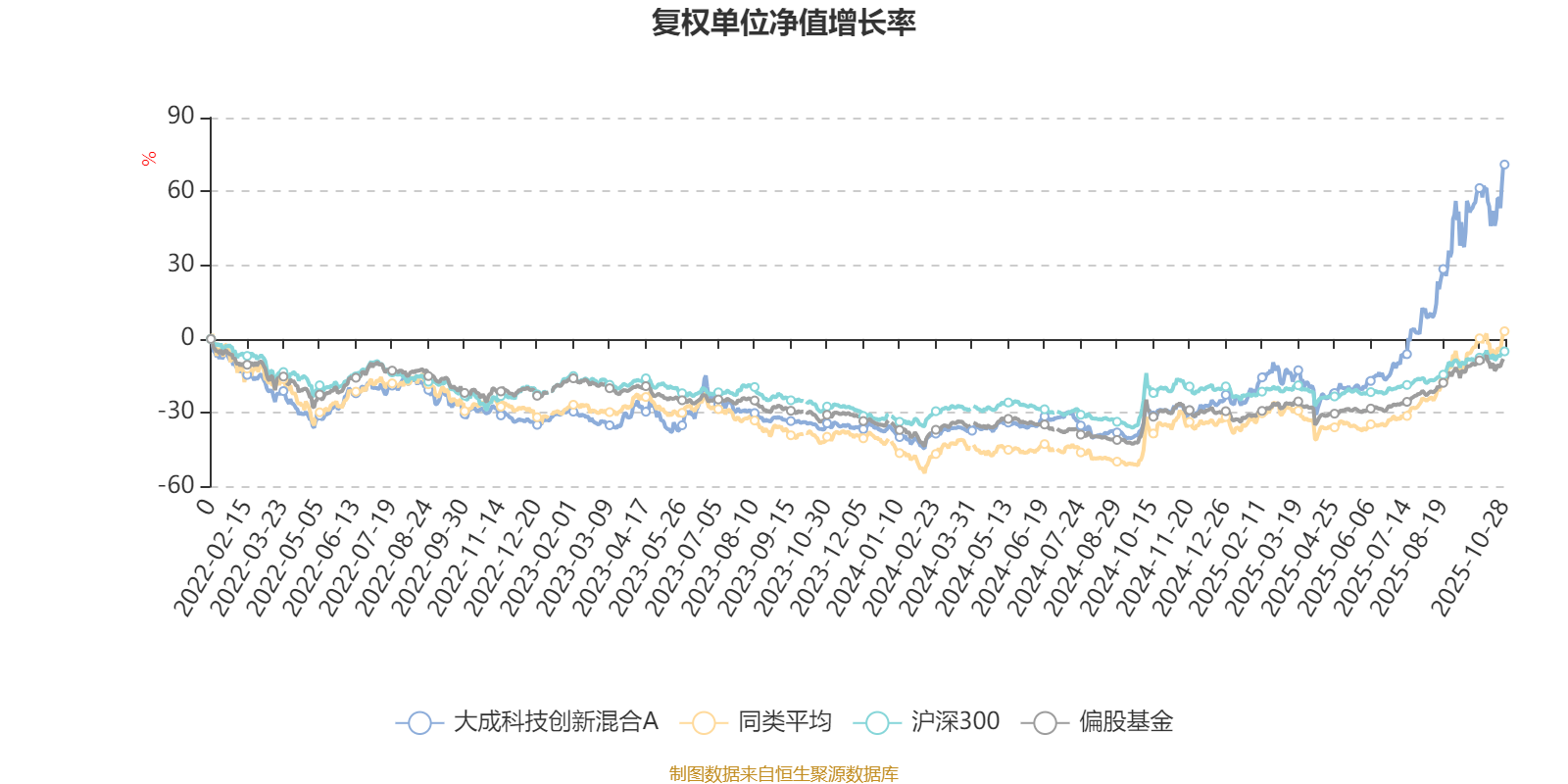截至10月28日,大成科技创新混合A近三个月复权单位净值增长率为59.50%,位于同类可比基金22/229;近半年复权单位净值增长率为118.32%,位于同类可比基金13/229;近一年复权单位净值增长率为140.64%,位于同类可比基金2/213;近三年复权单位净值增长率为144.49%,位于同类可比基金3/158。