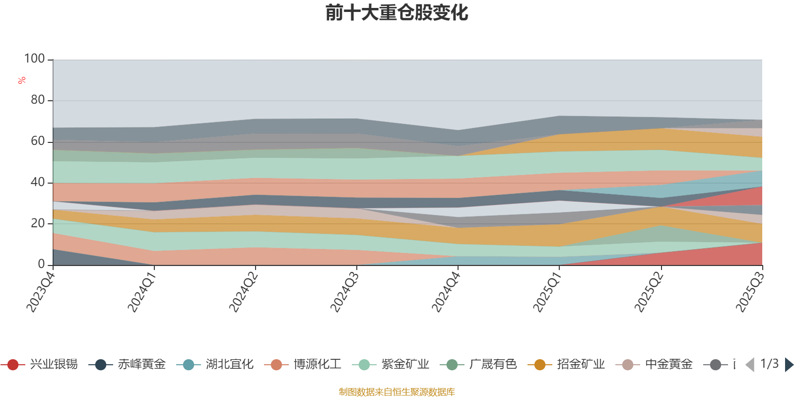 该基金持股集中度较高,近2年前十大重仓股集中度长期超过60%。截至2025年三季度末,基金十大重仓股分别是兴业银锡、山东黄金、招金矿业、锡业股份、HTSC(06886)、赛轮轮胎、中曼石油、中金黄金、中远海能、海南橡胶。