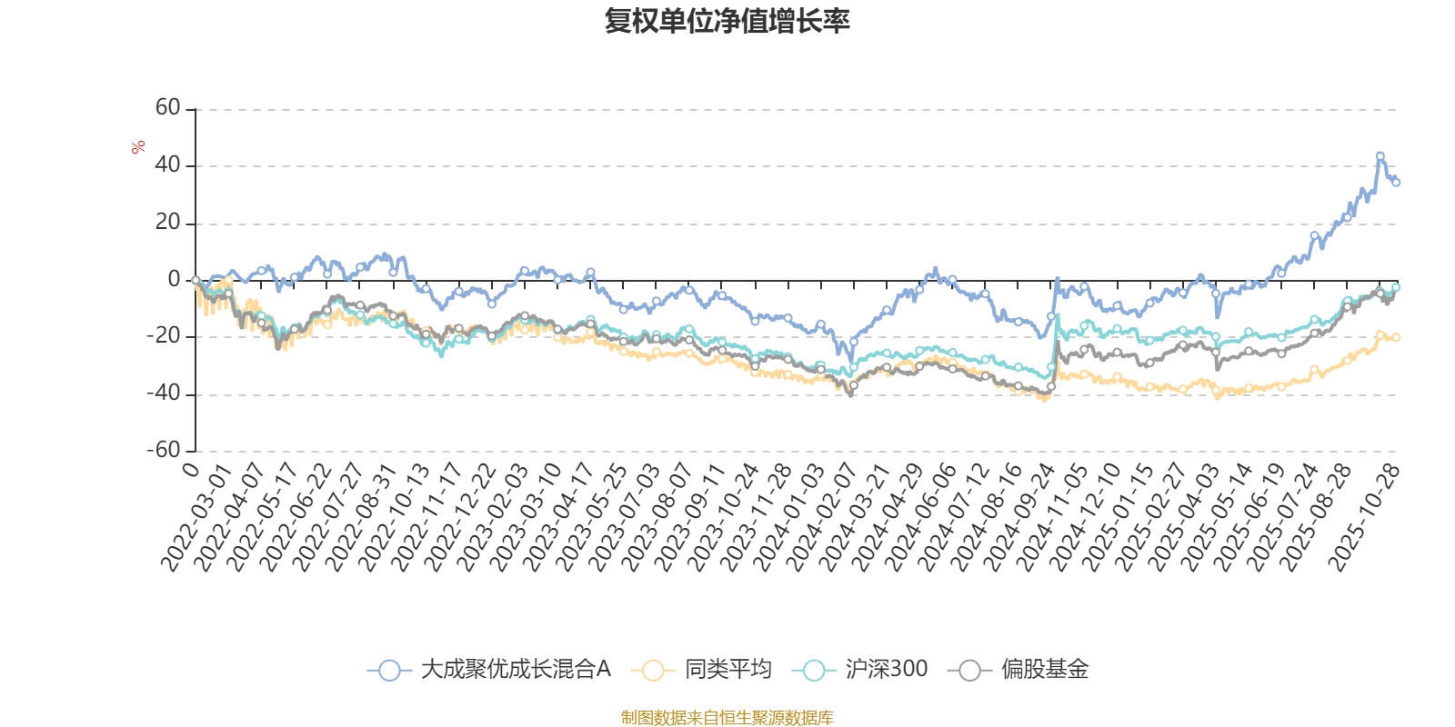 截至10月28日,大成聚优成长混合A近三个月复权单位净值增长率为16.82%,位于同类可比基金27/49;近半年复权单位净值增长率为40.58%,位于同类可比基金16/49;近一年复权单位净值增长率为39.31%,位于同类可比基金10/42;近三年复权单位净值增长率为48.59%,位于同类可比基金6/29。