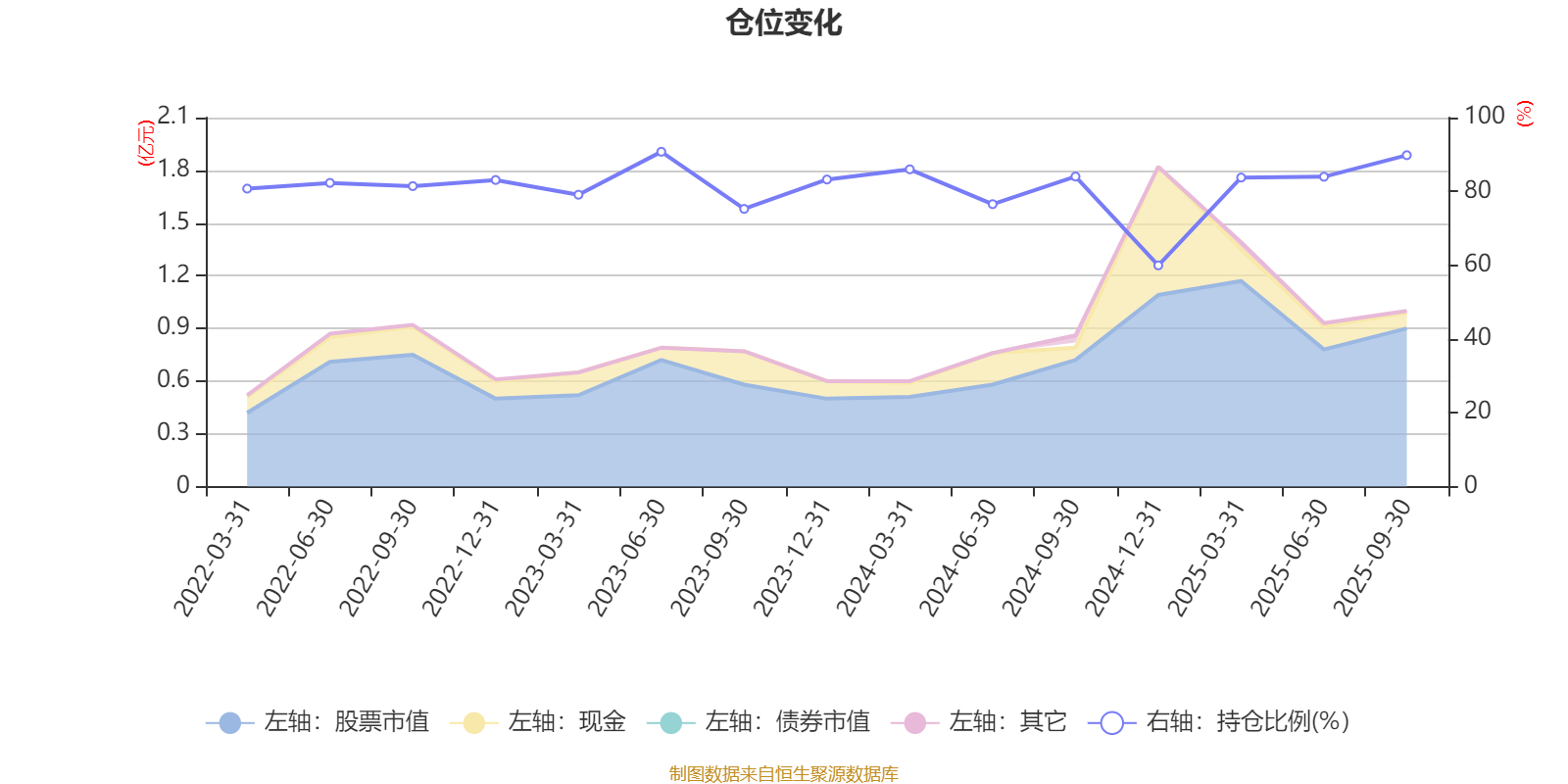 据定期报告数据统计,近三年平均股票仓位为81.29%,同类平均为87.09%。2023年上半年末基金达到90.74%的最高仓位,2024年末最低,为59.95%。