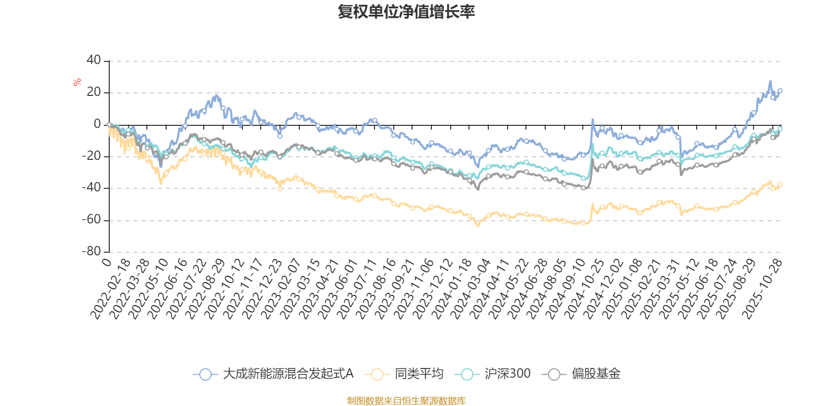 截至10月28日,大成新能源混合发起式A近三个月复权单位净值增长率为26.77%,位于同类可比基金32/100;近半年复权单位净值增长率为44.88%,位于同类可比基金19/99;近一年复权单位净值增长率为24.67%,位于同类可比基金44/90;近三年复权单位净值增长率为21.80%,位于同类可比基金11/62。