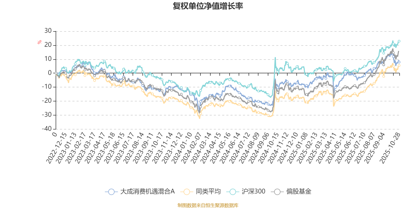 截至10月28日,大成消费机遇混合A近三个月复权单位净值增长率为5.21%,位于同类可比基金555/689;近半年复权单位净值增长率为13.86%,位于同类可比基金576/688;近一年复权单位净值增长率为15.07%,位于同类可比基金489/653。