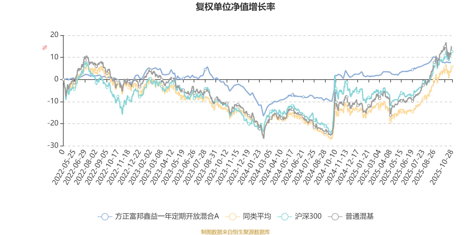 截至10月24日,方正富邦鑫益一年定期开放混合A近三个月复权单位净值增长率为1.60%,位于同类可比基金124/134;近半年复权单位净值增长率为5.46%,位于同类可比基金126/134;近一年复权单位净值增长率为5.27%,位于同类可比基金118/130;近三年复权单位净值增长率为8.84%,位于同类可比基金89/119。