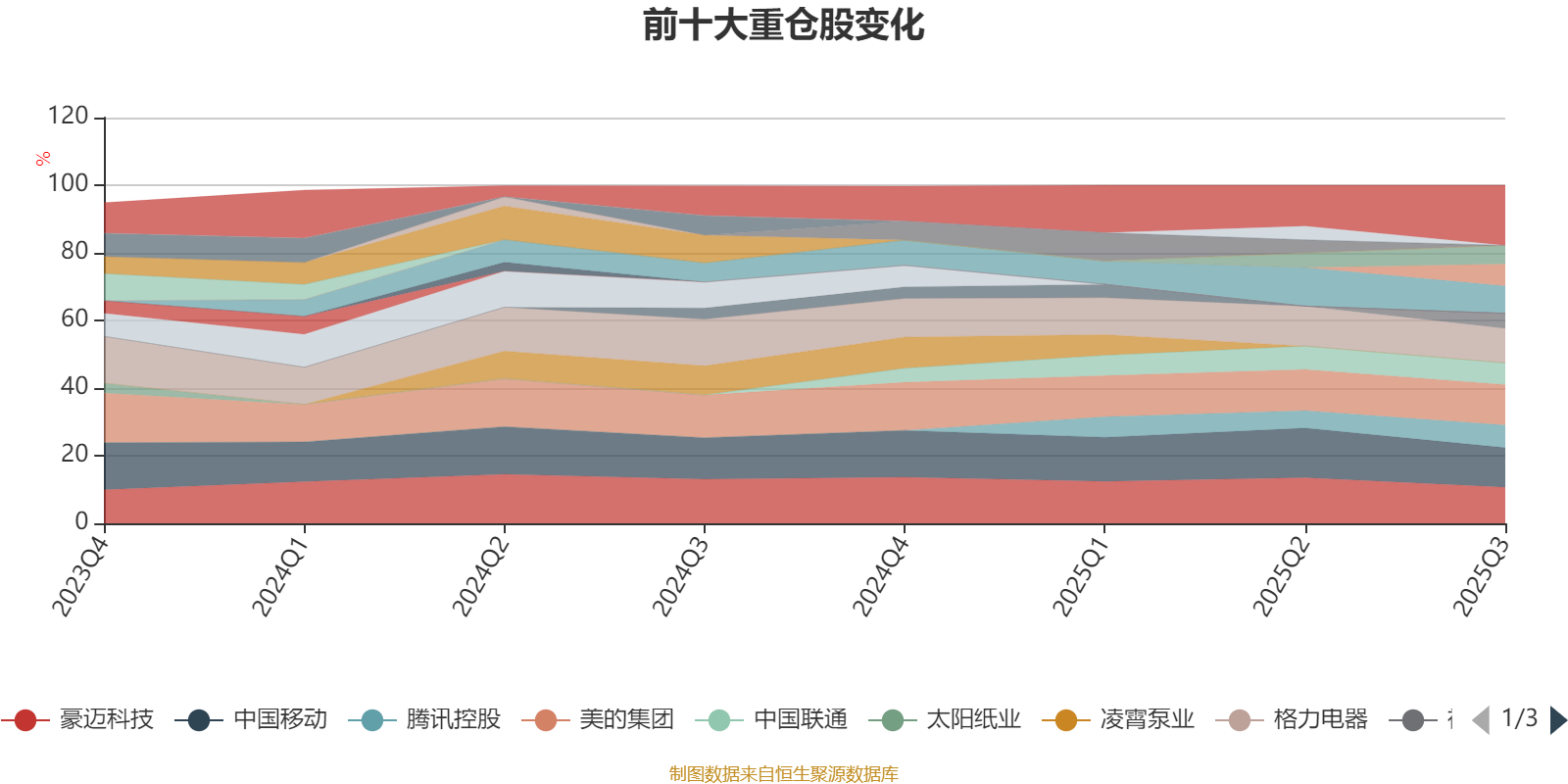 该基金持股集中度较高,近2年前十大重仓股集中度长期超过60%。截至2025年三季度末,基金十大重仓股分别是美的集团、中国移动、豪迈科技、格力电器、中国海洋石油、腾讯控股、华域汽车、中国联通、海尔智家、福耀玻璃。