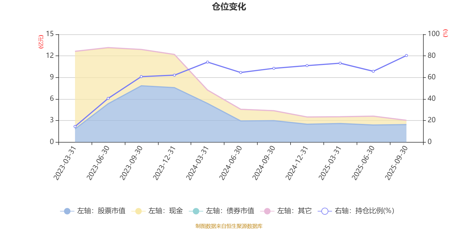 据定期报告数据统计,成立以来平均股票仓位为61.43%,同类平均为85.66%。2025年三季度末基金达到80.34%的最高仓位,2023年一季度末最低,为14.5%。