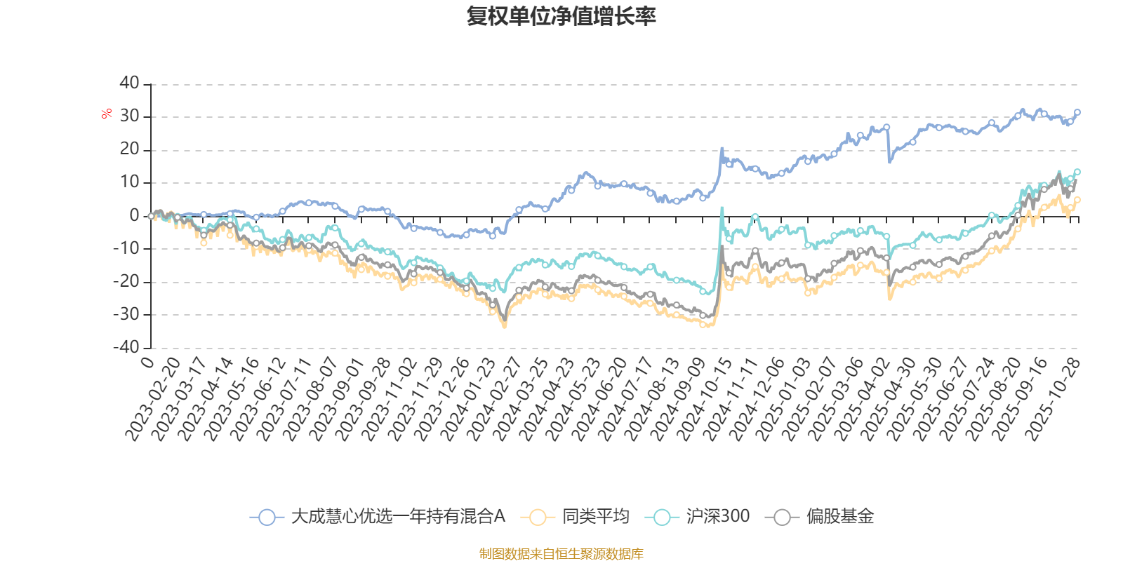 截至10月28日,大成慧心优选一年持有混合A近三个月复权单位净值增长率为3.18%,位于同类可比基金554/621;近半年复权单位净值增长率为7.38%,位于同类可比基金598/619;近一年复权单位净值增长率为13.19%,位于同类可比基金498/611。