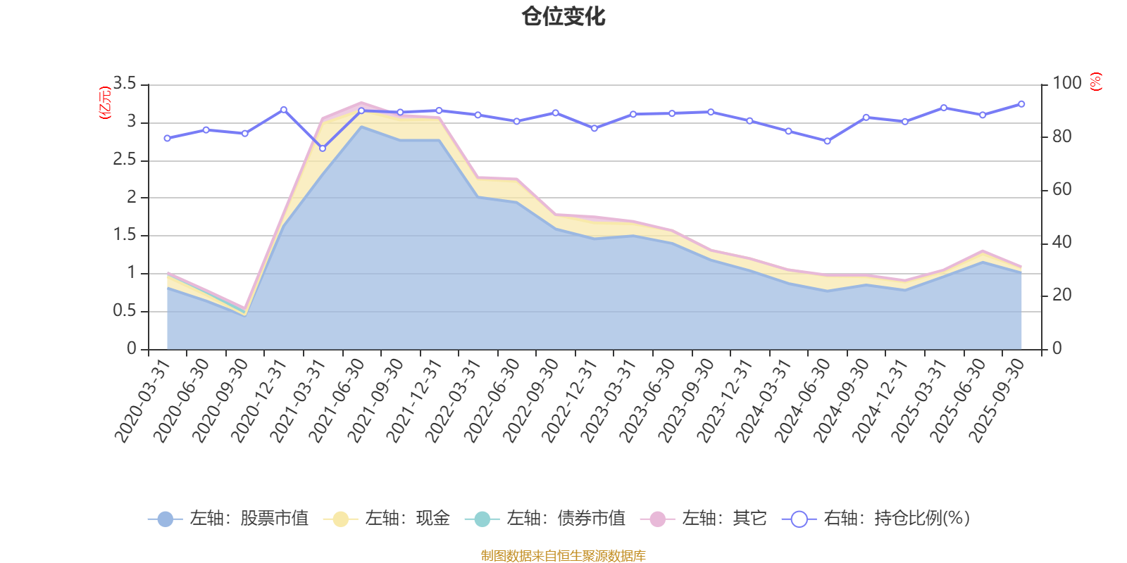 据定期报告数据统计,近三年平均股票仓位为87%,同类平均为83.73%。2025年三季度末基金达到92.62%的最高仓位,2021年一季度末最低,为75.87%。
