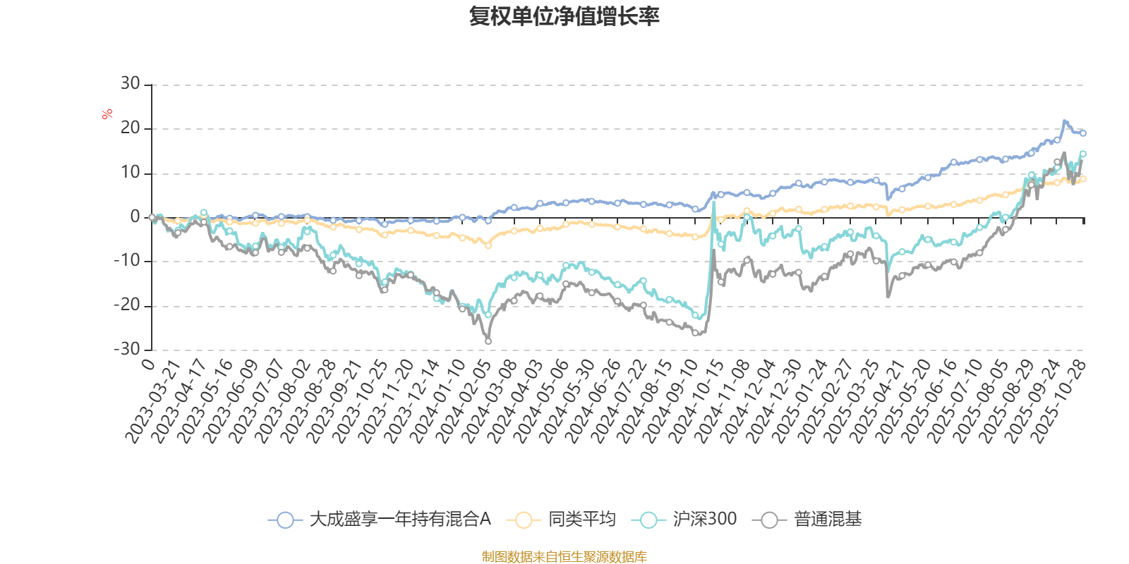 截至10月28日,大成盛享一年持有混合A近三个月复权单位净值增长率为5.02%,位于同类可比基金102/629;近半年复权单位净值增长率为10.73%,位于同类可比基金78/629;近一年复权单位净值增长率为13.26%,位于同类可比基金63/623。