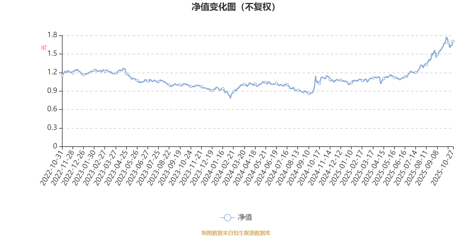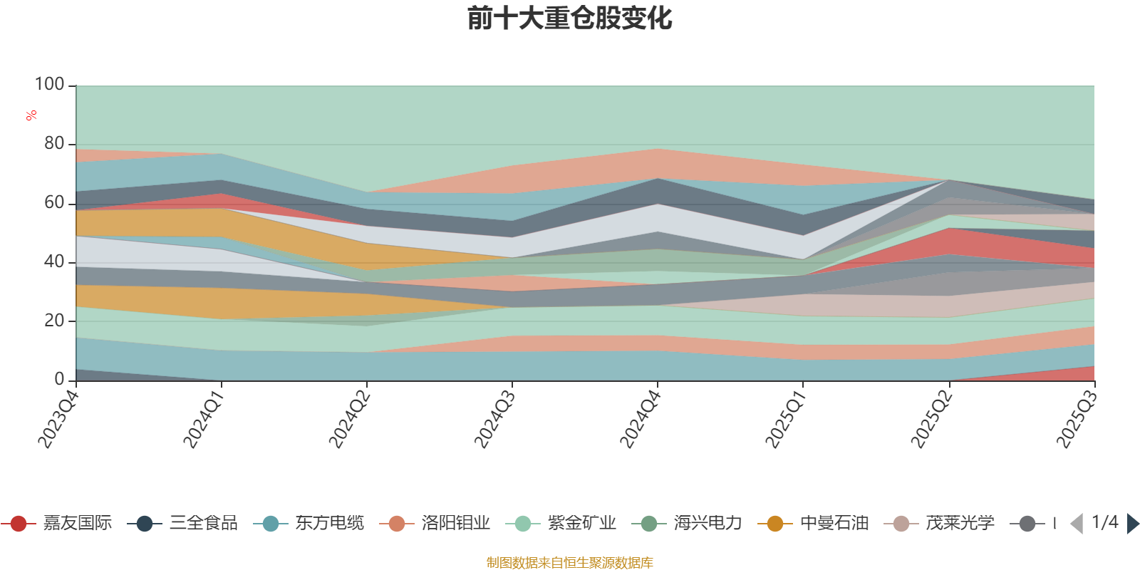 该基金持股集中度较高,近2年前十大重仓股集中度长期超过60%。截至2025年三季度末,基金十大重仓股分别是紫金矿业、东方电缆、汇成真空、洛阳钼业、华海清科、圆通速递、茂莱光学、兆易创新、嘉友国际、山东威达。