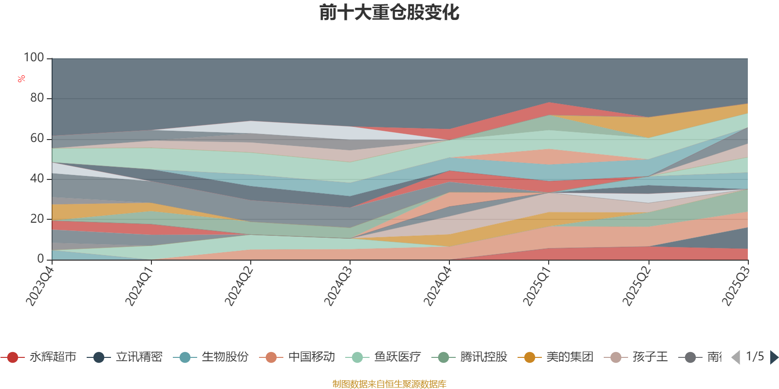 该基金持股集中度较高,近2年前十大重仓股集中度长期超过60%。截至2025年三季度末,基金十大重仓股分别是腾讯控股、立讯精密、三生制药、立华股份、中国移动、上海新阳、百亚股份、恩华药业、永辉超市、泰恩康。