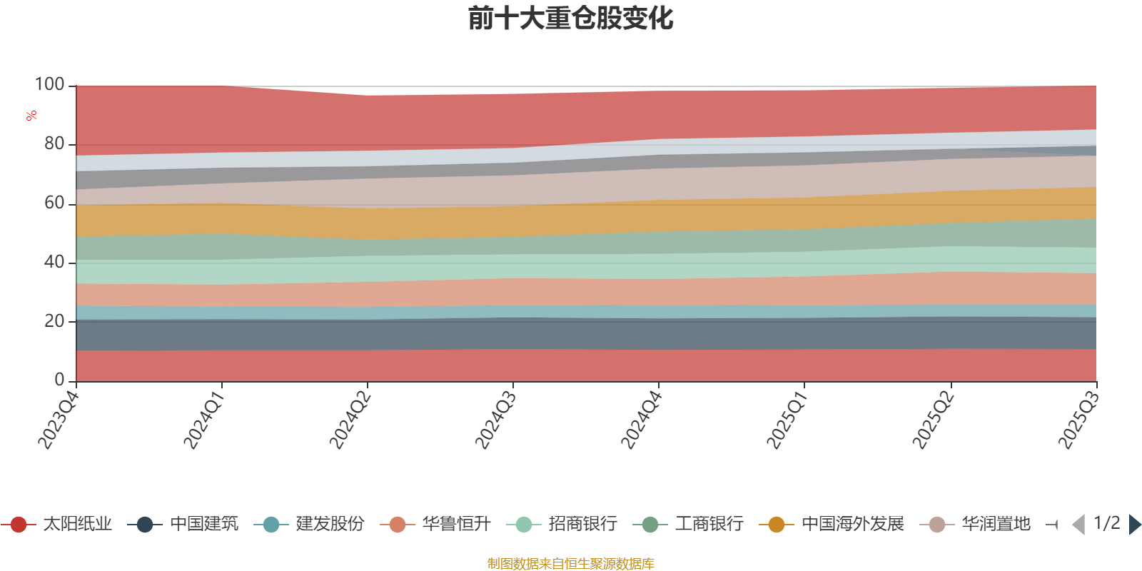 该基金持股集中度较高,且持股标的较为稳定,近2年前十大重仓股集中度长期超过60%。截至2025年三季度末,基金十大重仓股分别是太阳纸业、中国建筑、中国海外发展、华润置地、华鲁恒升、工商银行、招商银行、中国中铁、建发股份、美的集团。