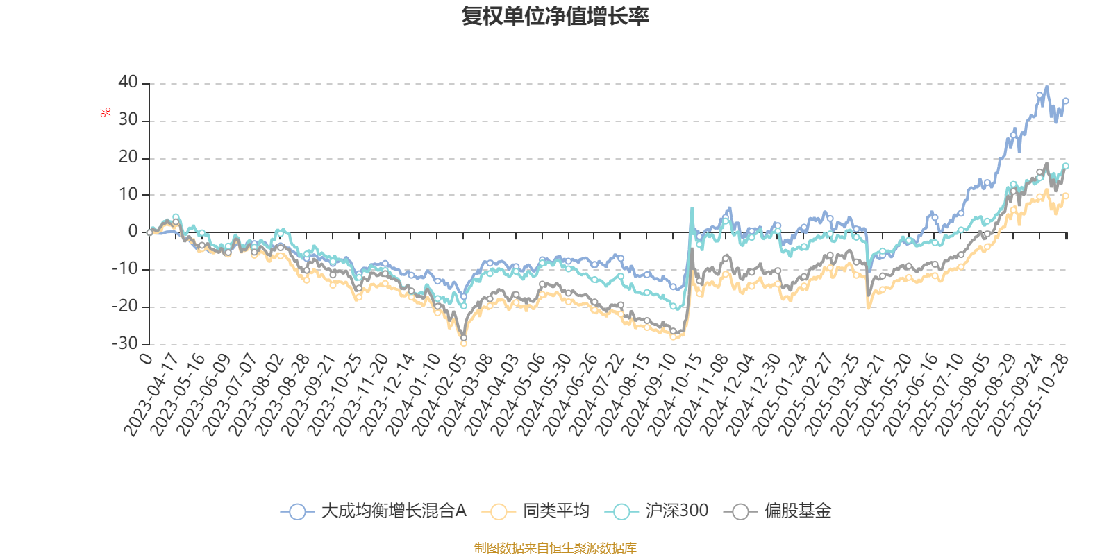 截至10月28日,大成均衡增长混合A近三个月复权单位净值增长率为20.11%,位于同类可比基金184/689;近半年复权单位净值增长率为44.32%,位于同类可比基金116/688;近一年复权单位净值增长率为33.15%,位于同类可比基金214/653。