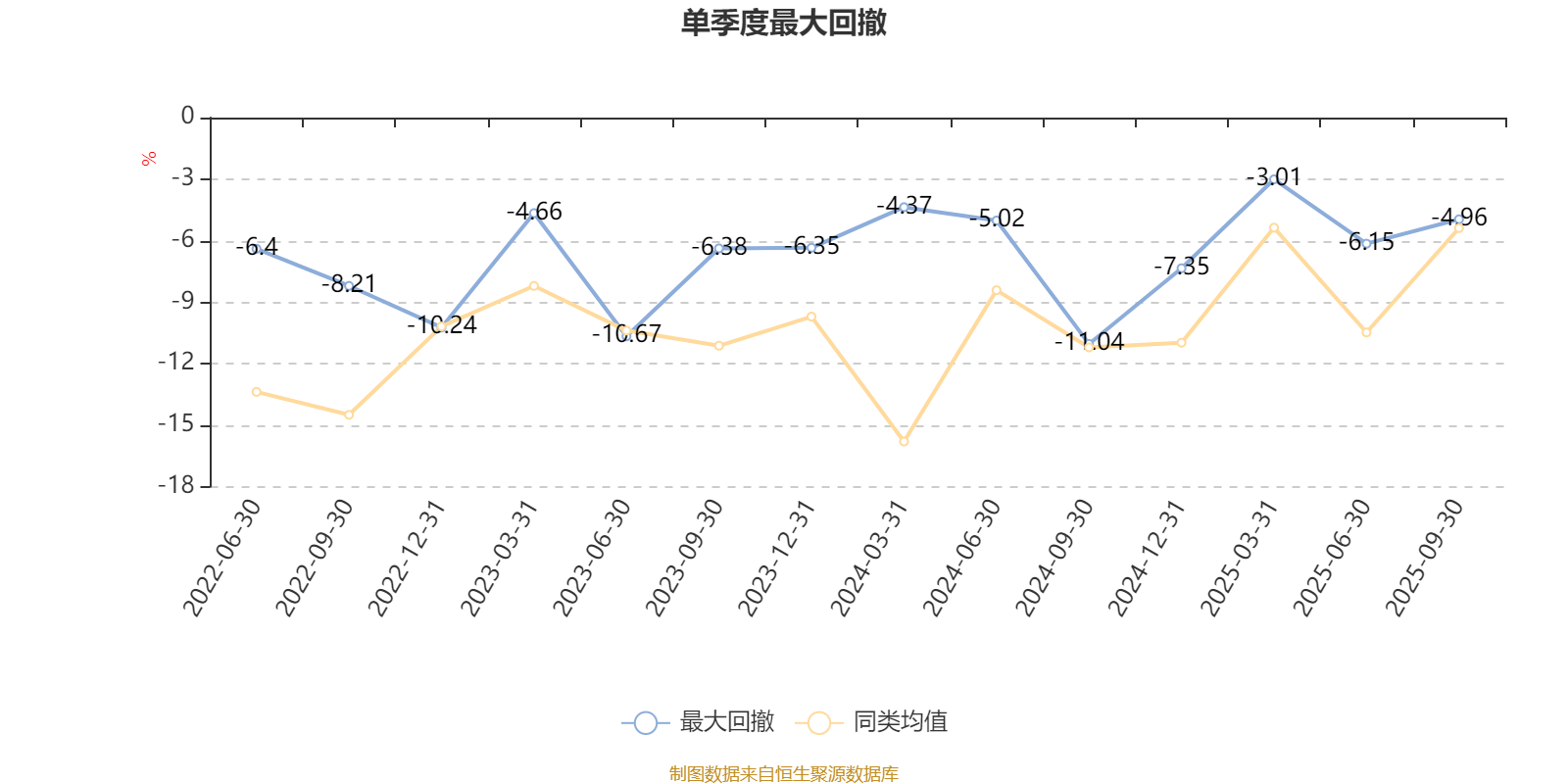 截至10月27日,基金近三年最大回撤为12.15%,同类可比基金排名3/251。单季度最大回撤出现在2024年三季度,为11.04%。