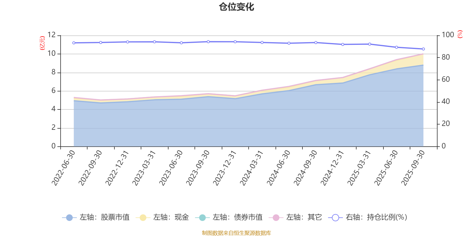 据定期报告数据统计,近三年平均股票仓位为92.64%,同类平均为85.99%。2023年三季度末基金达到94.33%的最高仓位,2025年三季度末最低,为87.78%。