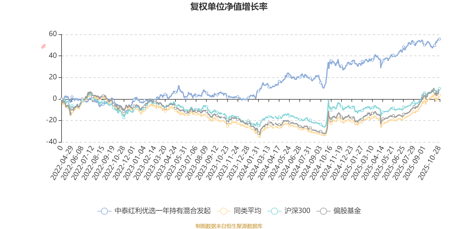 截至10月28日,中泰红利优选一年持有混合发起近三个月复权单位净值增长率为1.99%,位于同类可比基金248/265;近半年复权单位净值增长率为12.76%,位于同类可比基金238/265;近一年复权单位净值增长率为16.67%,位于同类可比基金198/265;近三年复权单位净值增长率为76.01%,位于同类可比基金10/253。