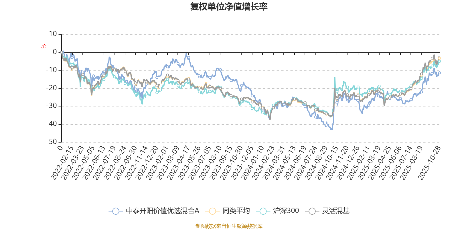 截至10月28日,中泰开阳价值优选混合A近三个月复权单位净值增长率为16.07%,位于同类可比基金472/1287;近半年复权单位净值增长率为19.32%,位于同类可比基金778/1287;近一年复权单位净值增长率为16.39%,位于同类可比基金767/1287;近三年复权单位净值增长率为17.07%,位于同类可比基金625/1286。